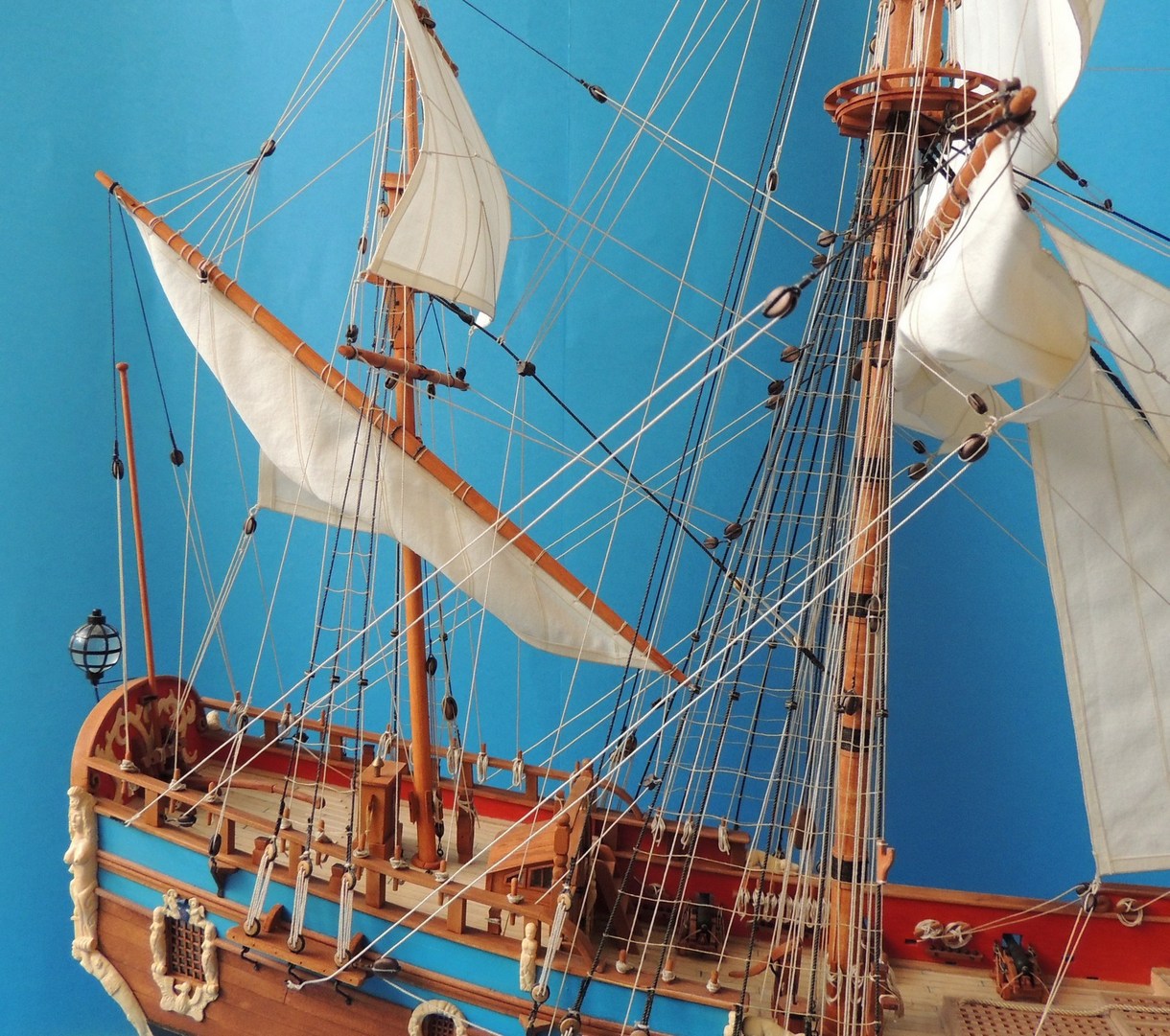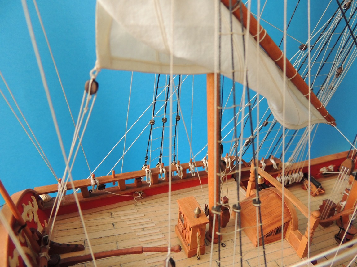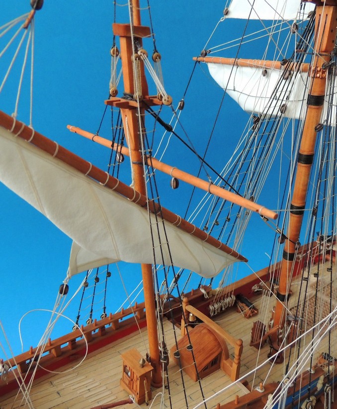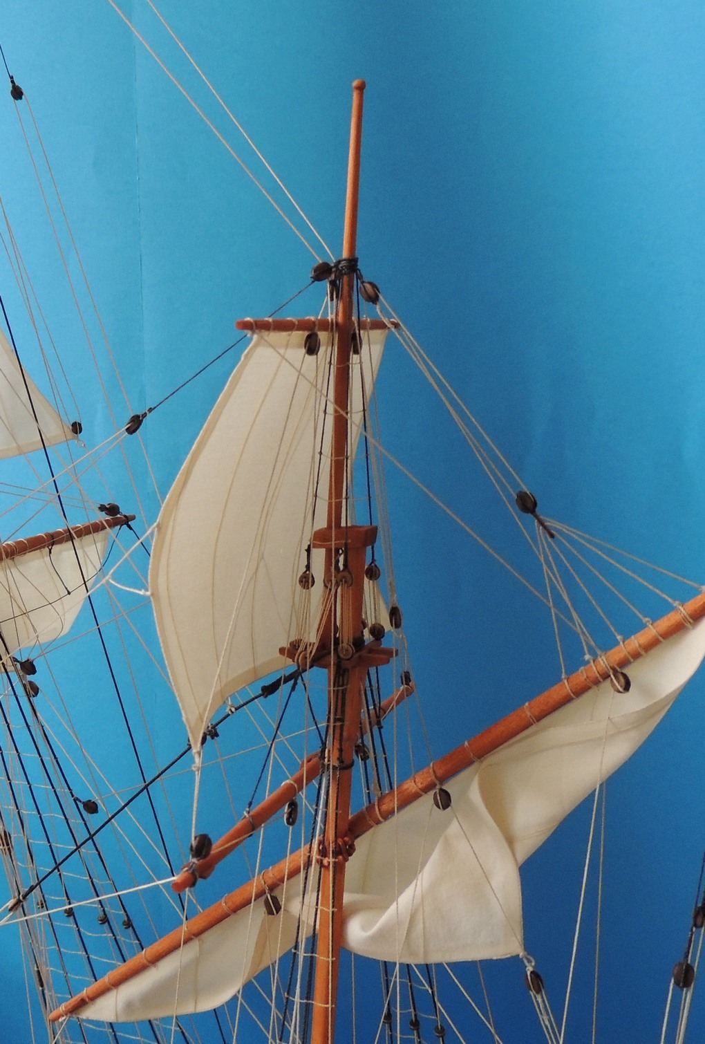 Ostatni żagiel zawieszony. Brasy też. Olinowanie gotowe :D Doszedł jeszcze taki mały drobiazg na wancie,widoczny na ostatnim zdjęciu. Nie wiem do czego służył, ale na replice jest, więc i ja go wykonałem.