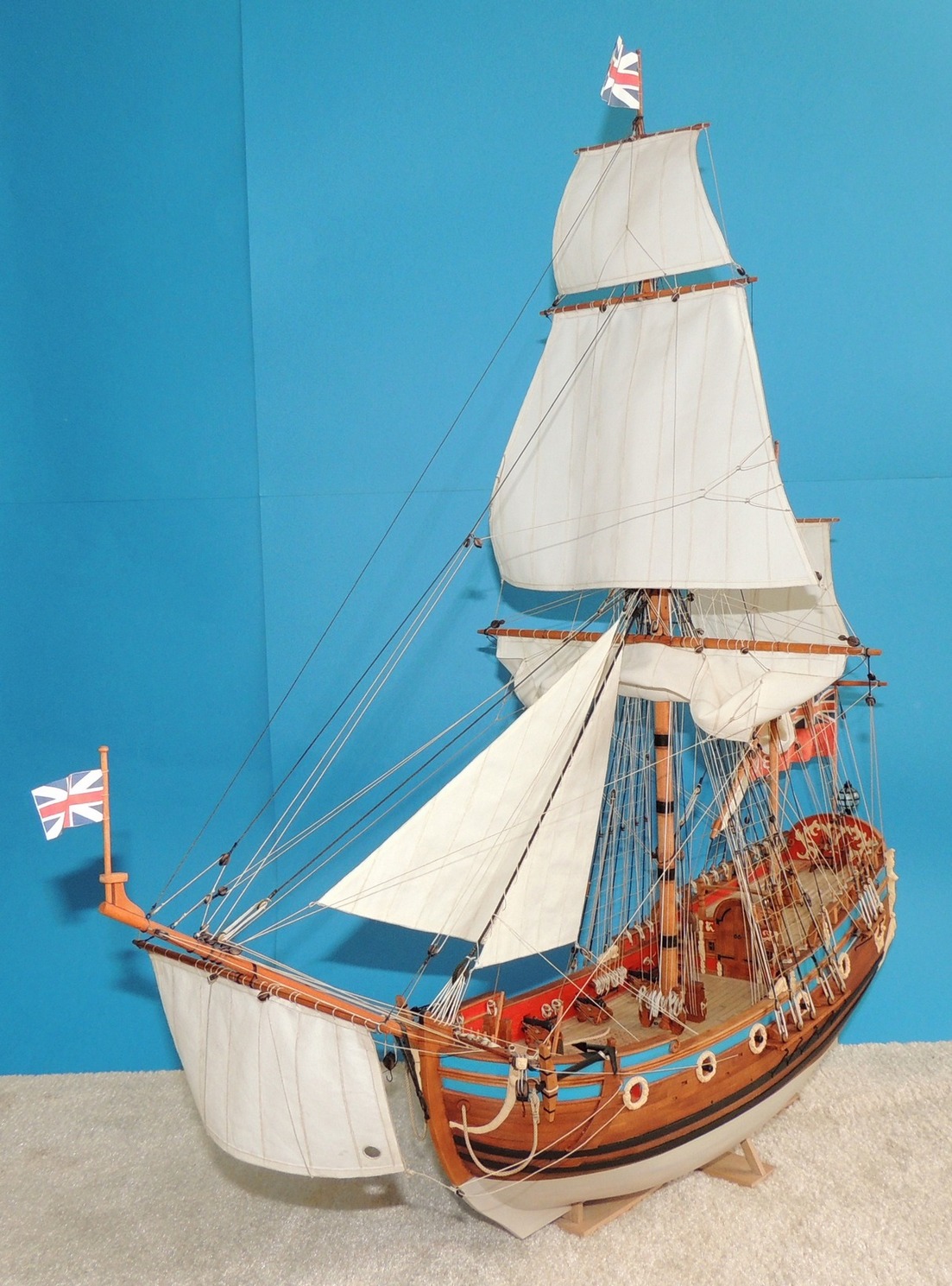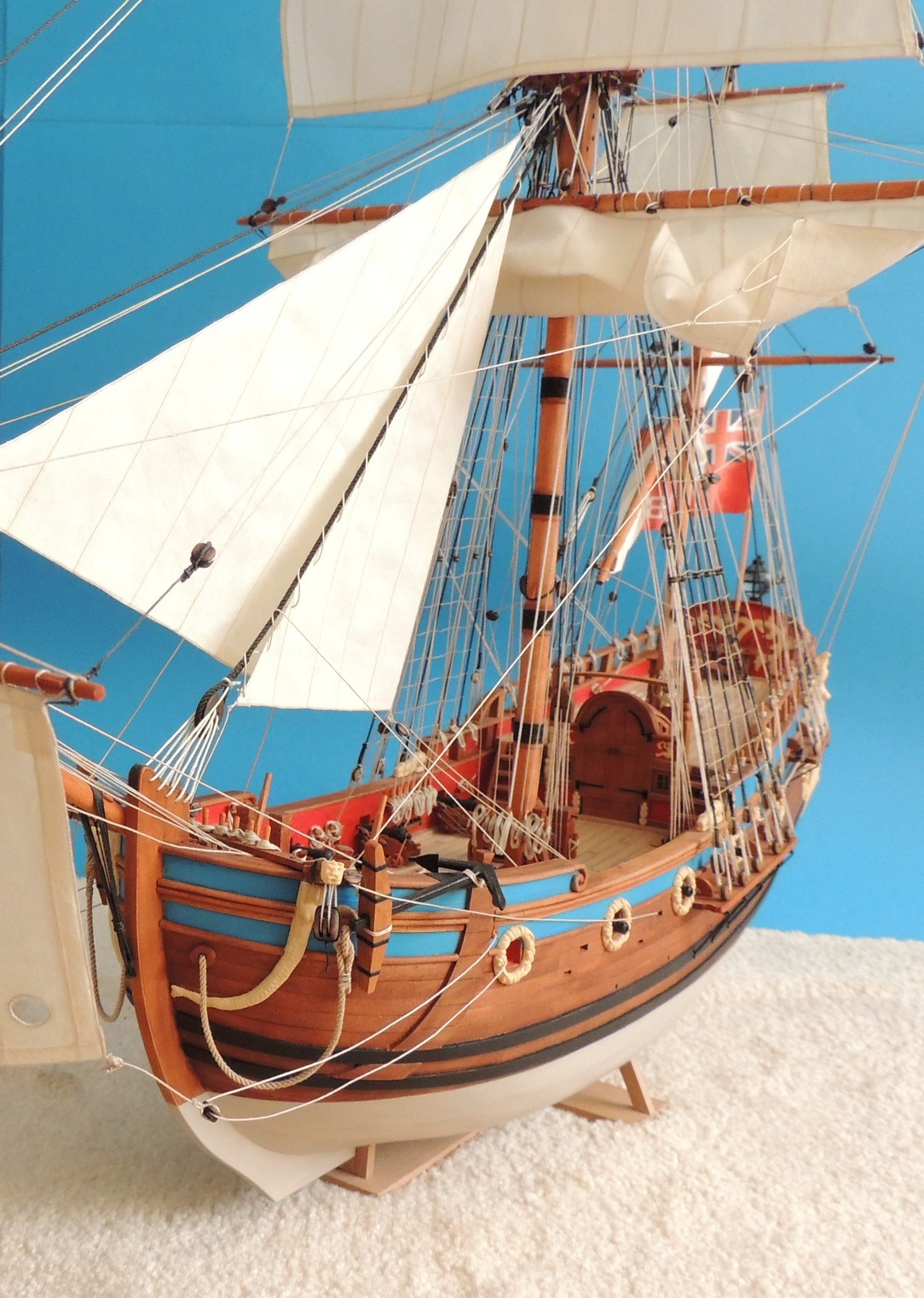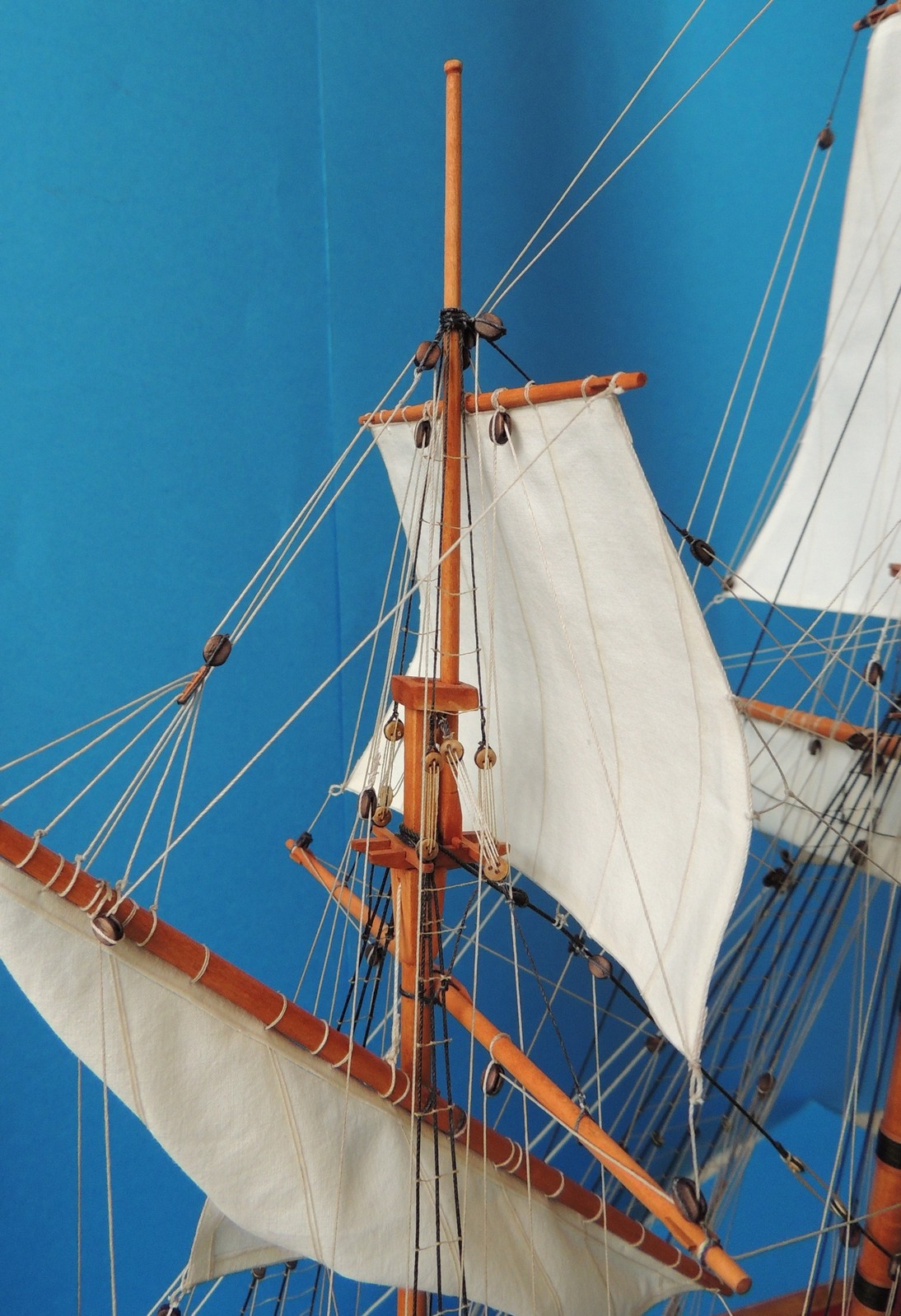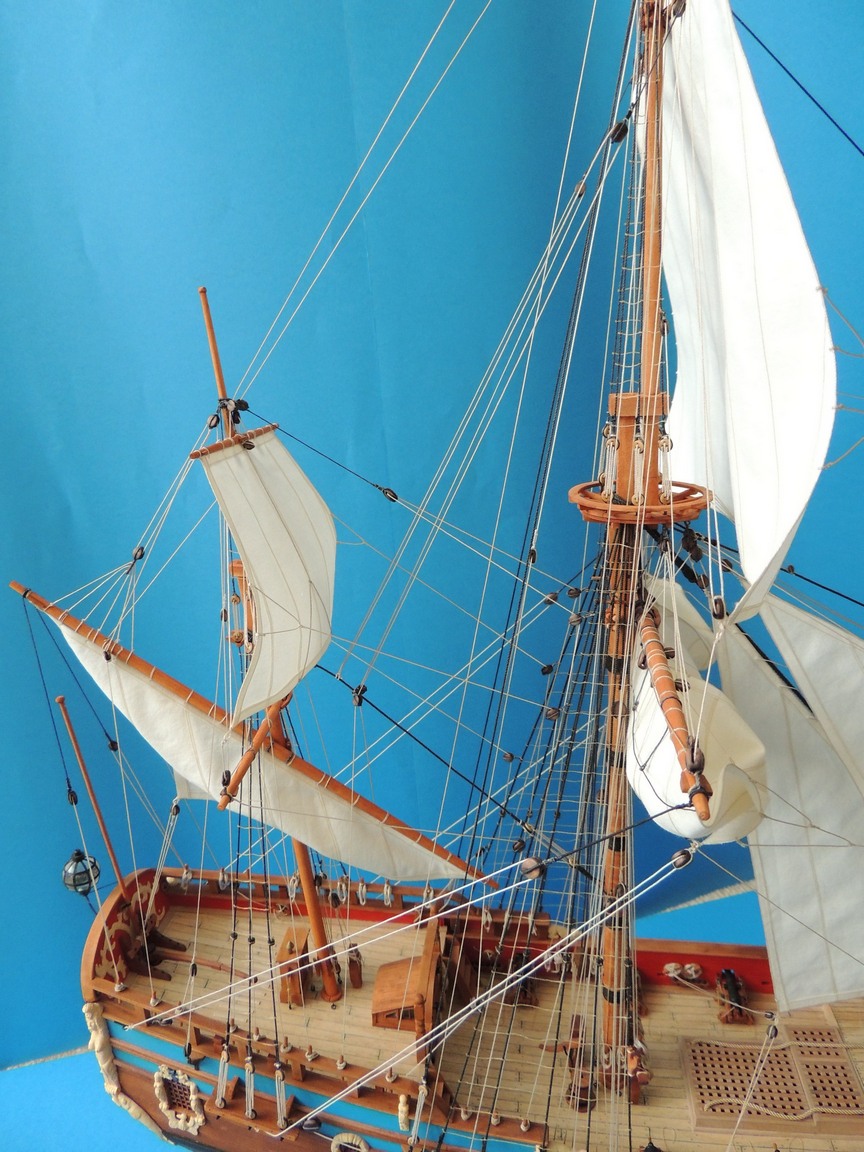 Ostatni żagiel zawieszony. Brasy też. Olinowanie gotowe :D Doszedł jeszcze taki mały drobiazg na wancie,widoczny na ostatnim zdjęciu. Nie wiem do czego służył, ale na replice jest, więc i ja go wykonałem.