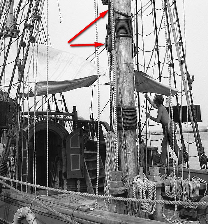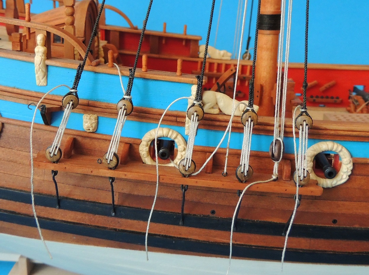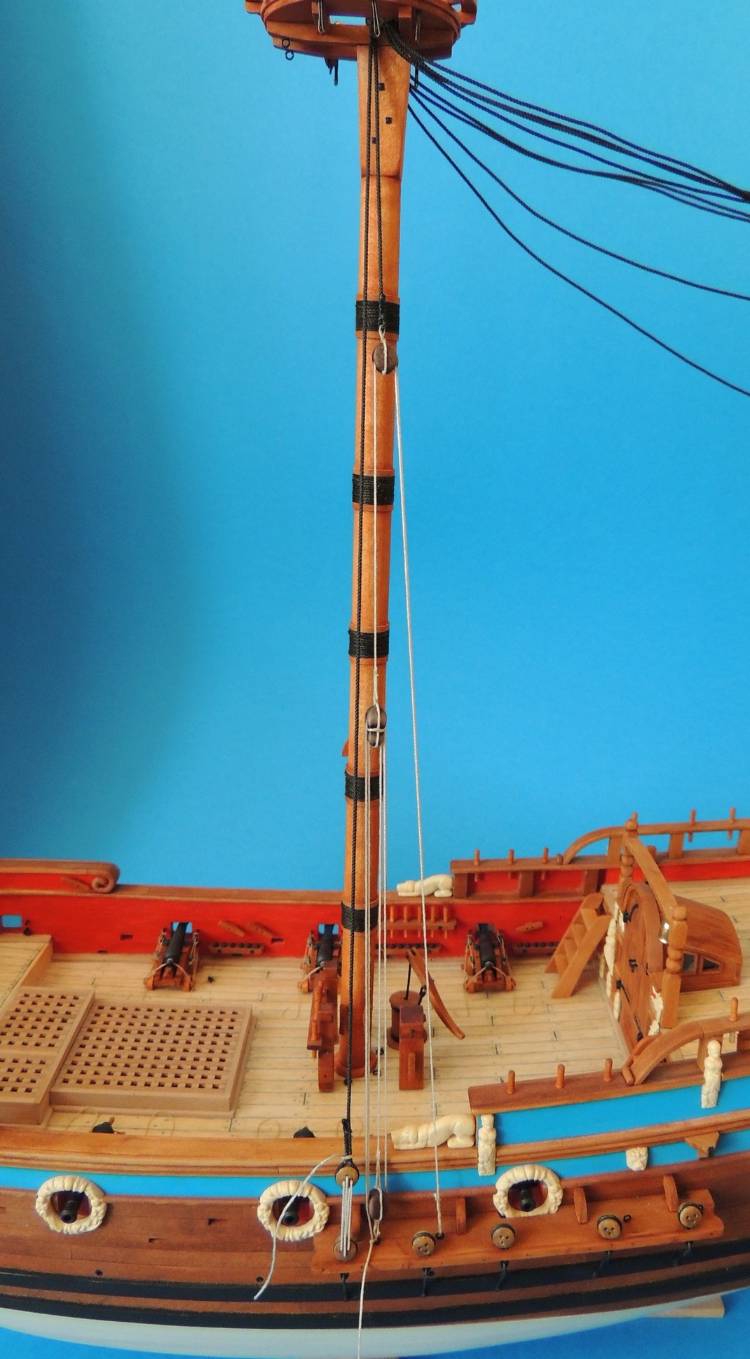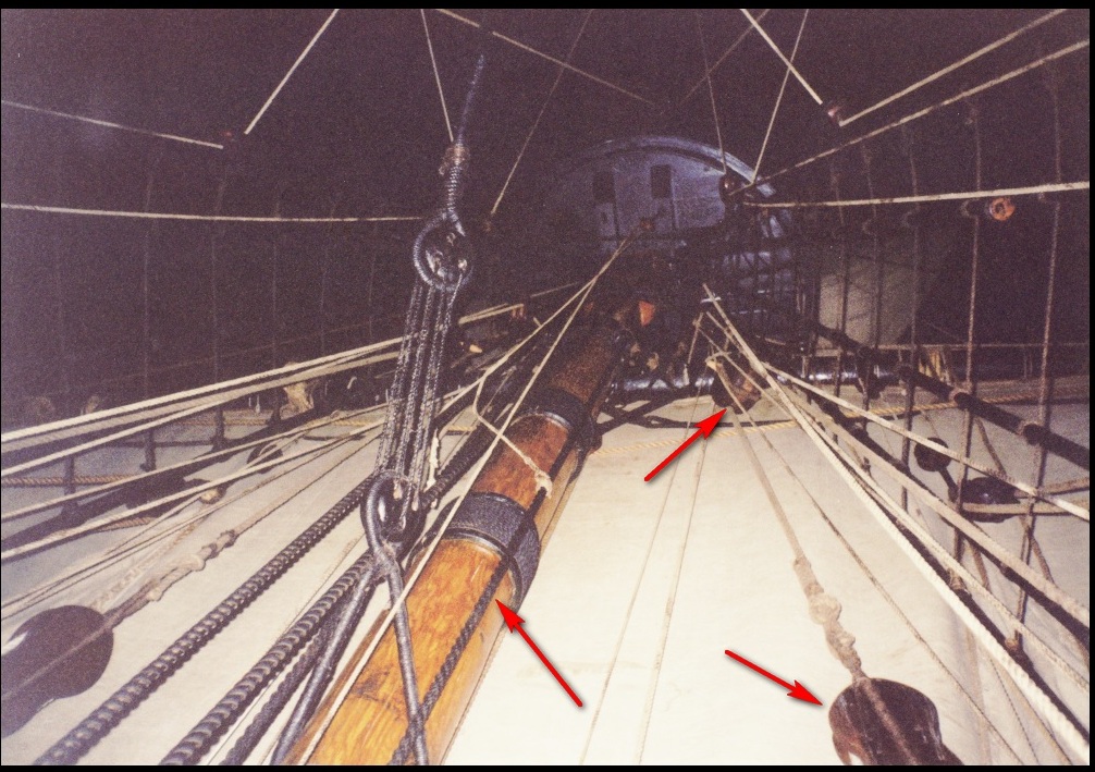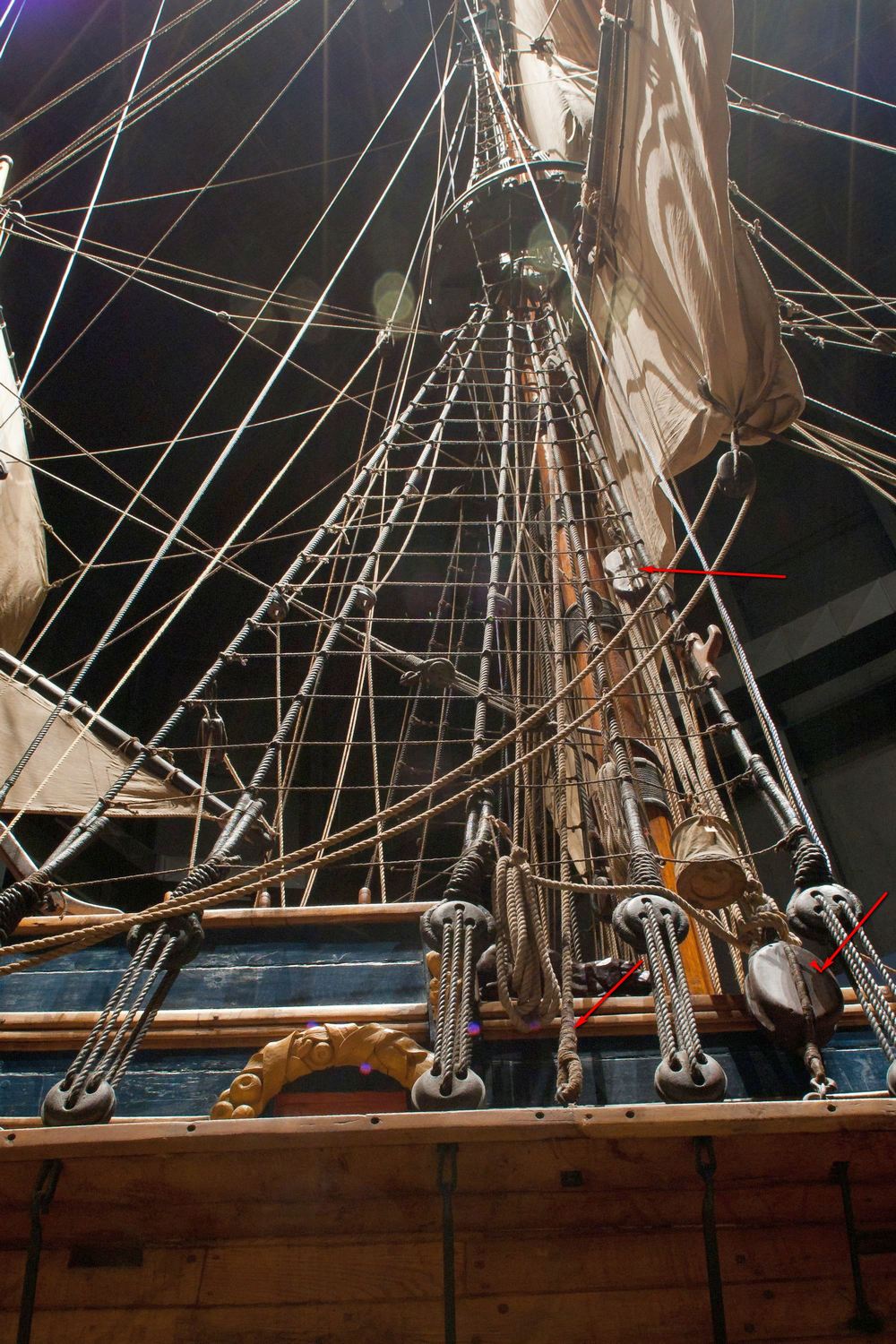 Jak wcześniej napisałem, zaczynam zabawę z olinowaniem.Chciałbym je w miarę dokładnie wykonać i będę miał sporo pytań. Na początek dwa elementy olinowania stałego(tak mi się wydaje), zaznaczone na pierwszym zdjęciu. Na pozostałych zdjęciach pozaznaczałem, które to liny.