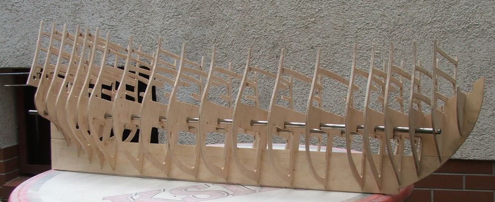 Pora zacząć nowy projekt.Wybór padł RK bo z tego samego okresu co Prince i o takich samych wymiarach.Jest ciekawie zdobiony no i dokumentacja była osiągalna.Wspomagam się obrazem RK gdzie namalowany jest z boku i z rufy. Wiele by się chciało zrobić ciekawych modeli ale wszystko rozbija się o brak dokumentacji .Wykonanie tradycyjne. Żebra ze sklejki 4mm,stępka 6mm. Wypełnienie cienkie deszczułki lipowe.Do cięcia żeber zmontowałem wyrzynarkę na bazie przystawki DyDa z ciężkim silnikiem.Całość jest masywna i pracuje spokojnie.Żebra do montażu przeszyte są prętami 10mm co gwarantuje mi że szkielet będzie właściwie osadzony.Potem oczywiście będą wyciągnięte.Po owierceniu żebra wycina się płynnie .No i chyba budowa zajmie mi sporo lat. Princa budowałem 10 lat. Mam motywację żeby dożyć do końca.Pozdrawiam.R