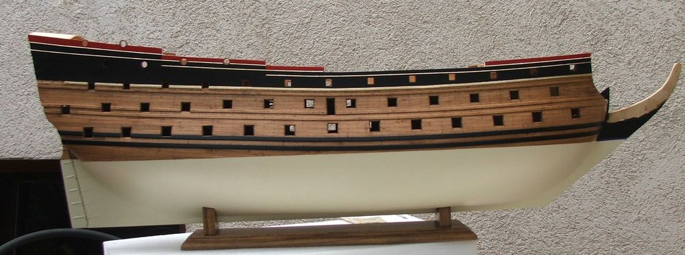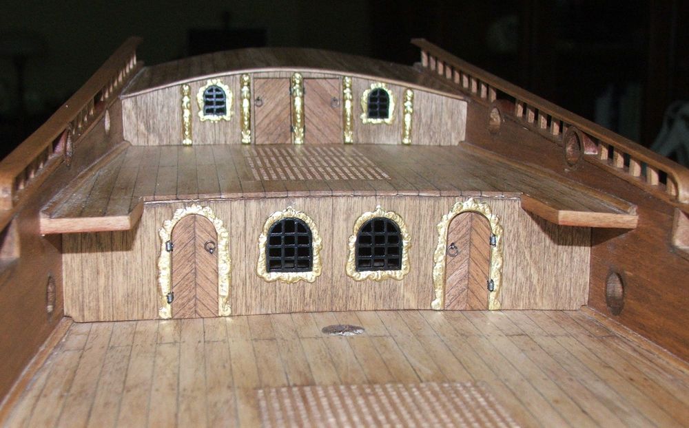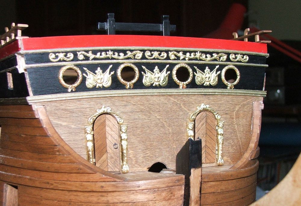 Pierwsze schody mam za sobą .Żmudna dłubanina .Efekt widać po czasie .Część dziobowa zyskała relingi i nową barwę .Na czarnym tle złote ozdoby prezentują się lepiej .Pogoda nie sprzyja to może okręt zyska na tym .Pozdr.R