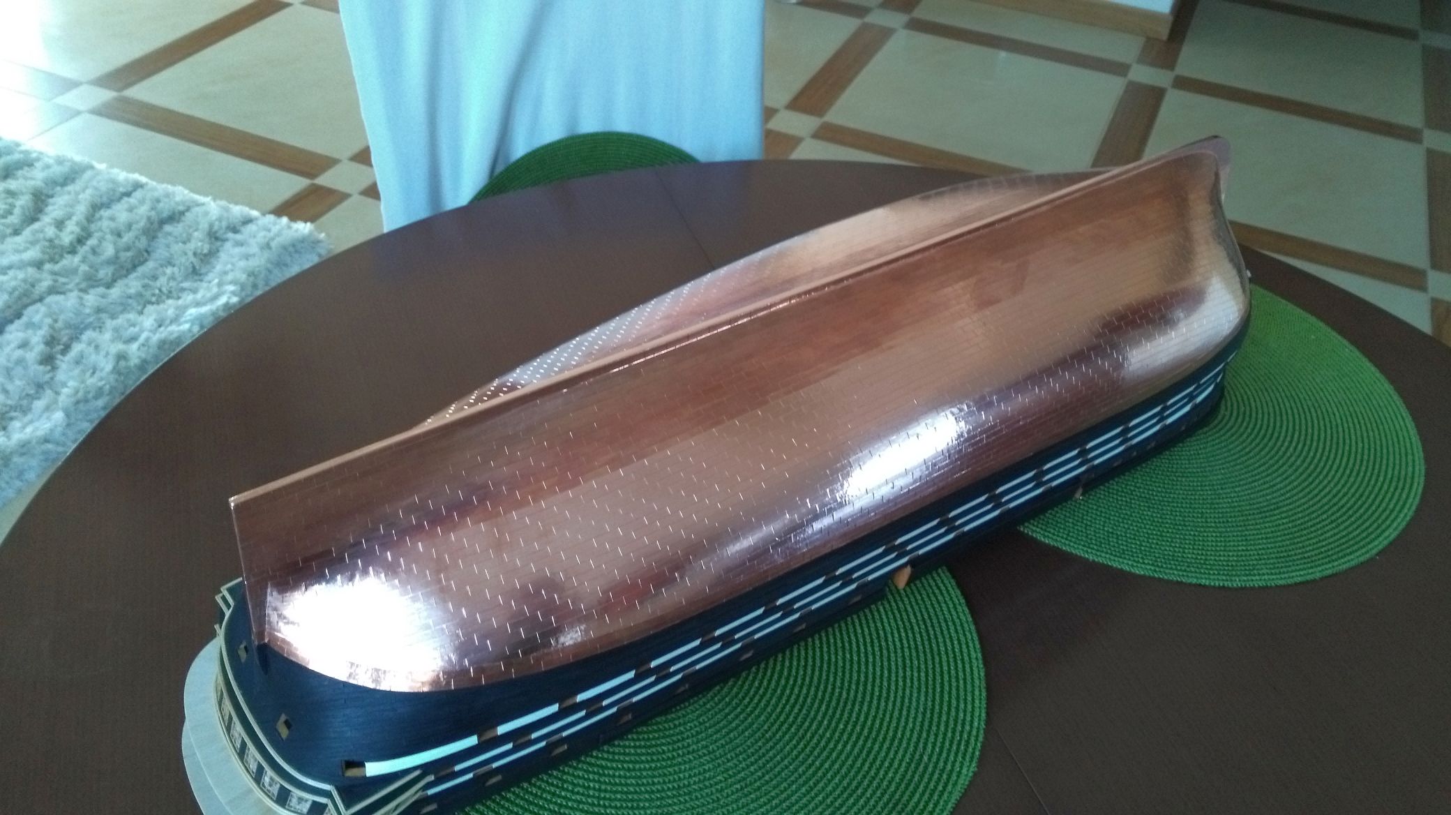 Prace przy miedziowaniu posuwają się pomału do przodu. Używam do tego celu taśmy "Master Foil Plus" z przeźroczystym klejem. Na uprzednio polakierowanym 2 razy i oczyszczonym podłożu trzyma bardzo dobrze, jedynie w miejscach gdzie dotykałem klej palcami jest trochę słabiej.