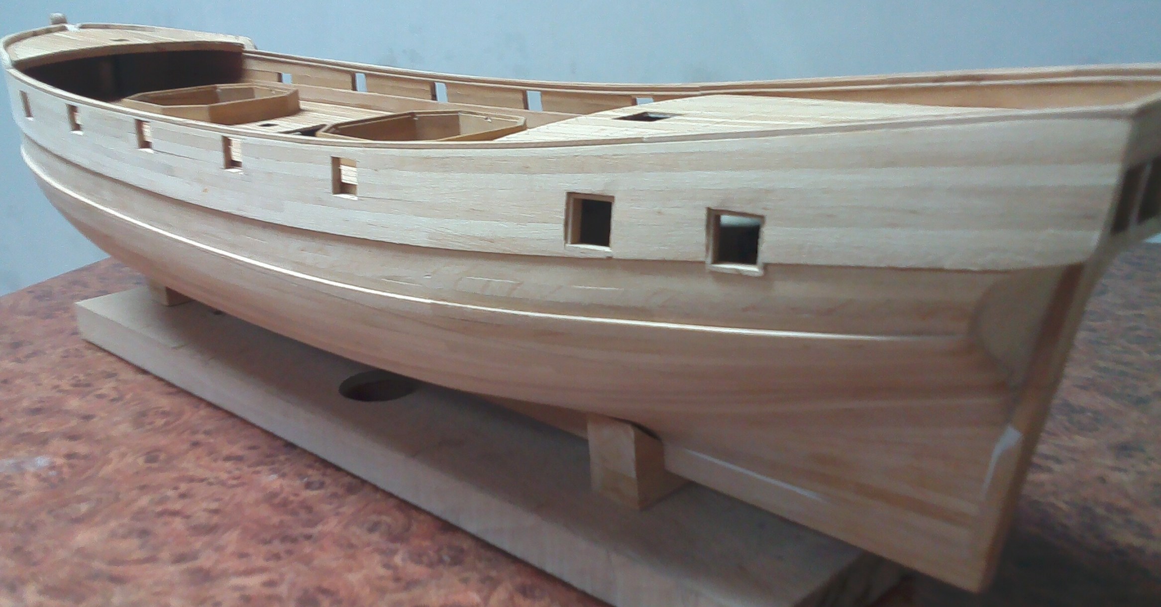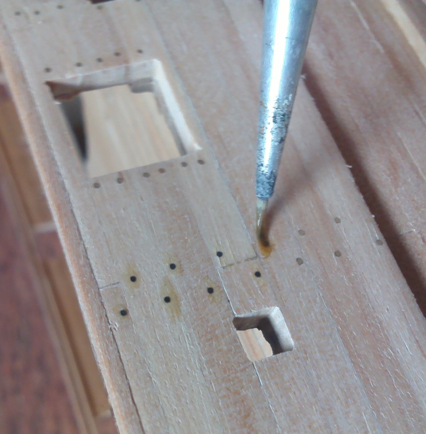 I jeszcze mała uwaga dotycząca pokładu. Zapewne modelarscy konserwatyści podniosą lament, ale pomalowałem pokład matowym lakierem bezbarwnym. Przy Batavii zastosowałem olej lniany, który bardzo zróżnicował odcienie klepek. Użycie lakieru dało w przypadku listewek brzozowych, które zastosowałem, znacznie lepszy efekt. ;)