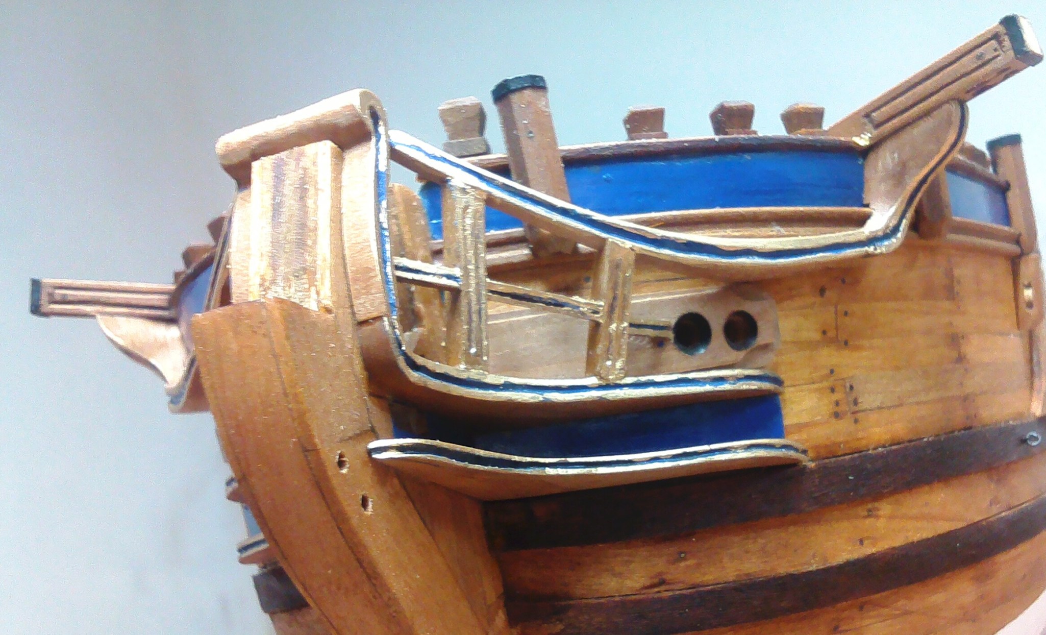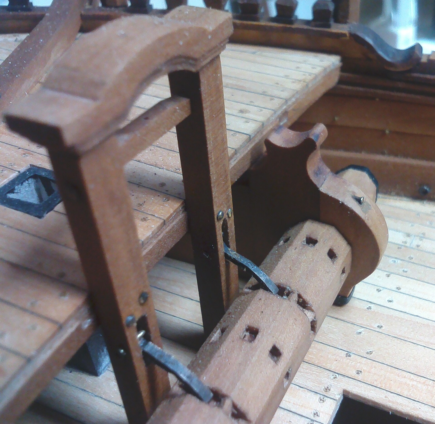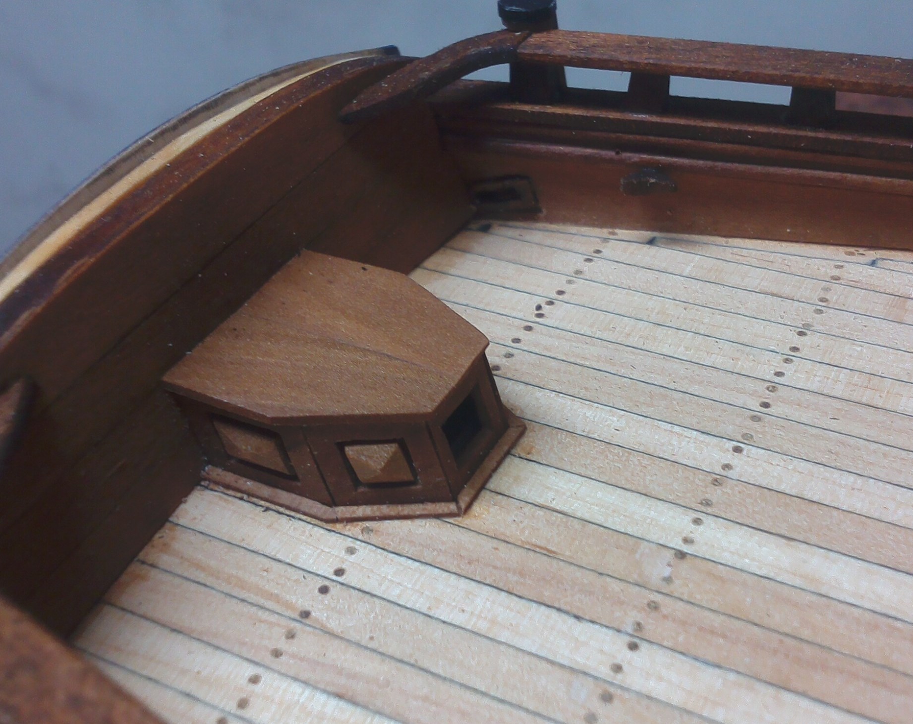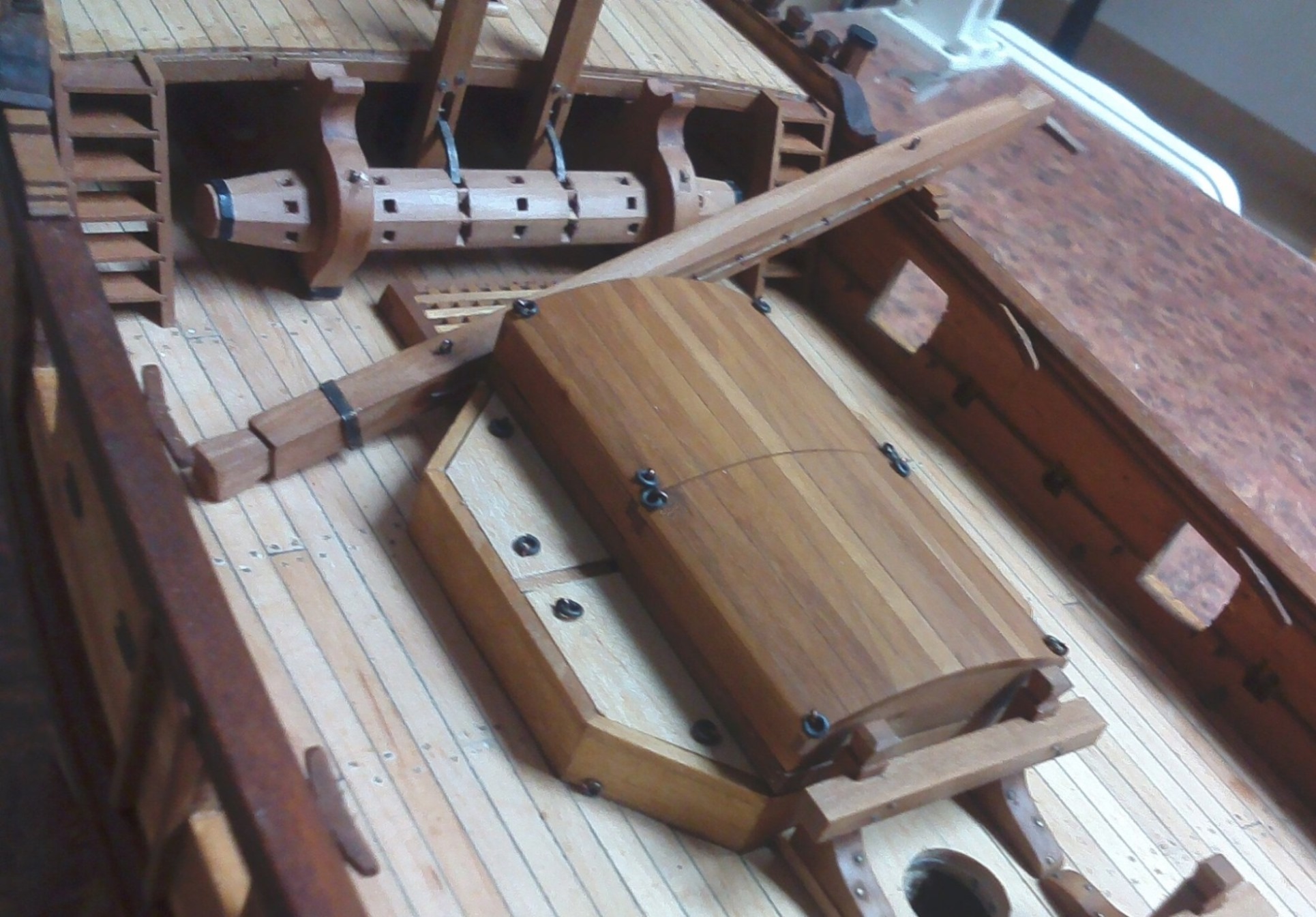 Przybyło całkiem sporo drobnych detali; pachoły, knagi, bloki itp.:Są też nieco większe szczegóły wyposażenia pokładowego; tu obudowa górnej części steru:Pachoły przymasztowe i zrębnica wraz z pokrywami:Zamontowany kabestan, brakuje jeszcze dzwonu:Kosz dziobowy. Nie jestem do końca zadowolony, ale nawet takie wykonanie kosztowało sporo pracy:Kadłub po olejowaniu nabrał innego wyrazu: