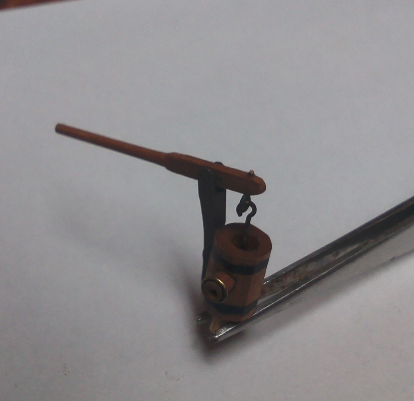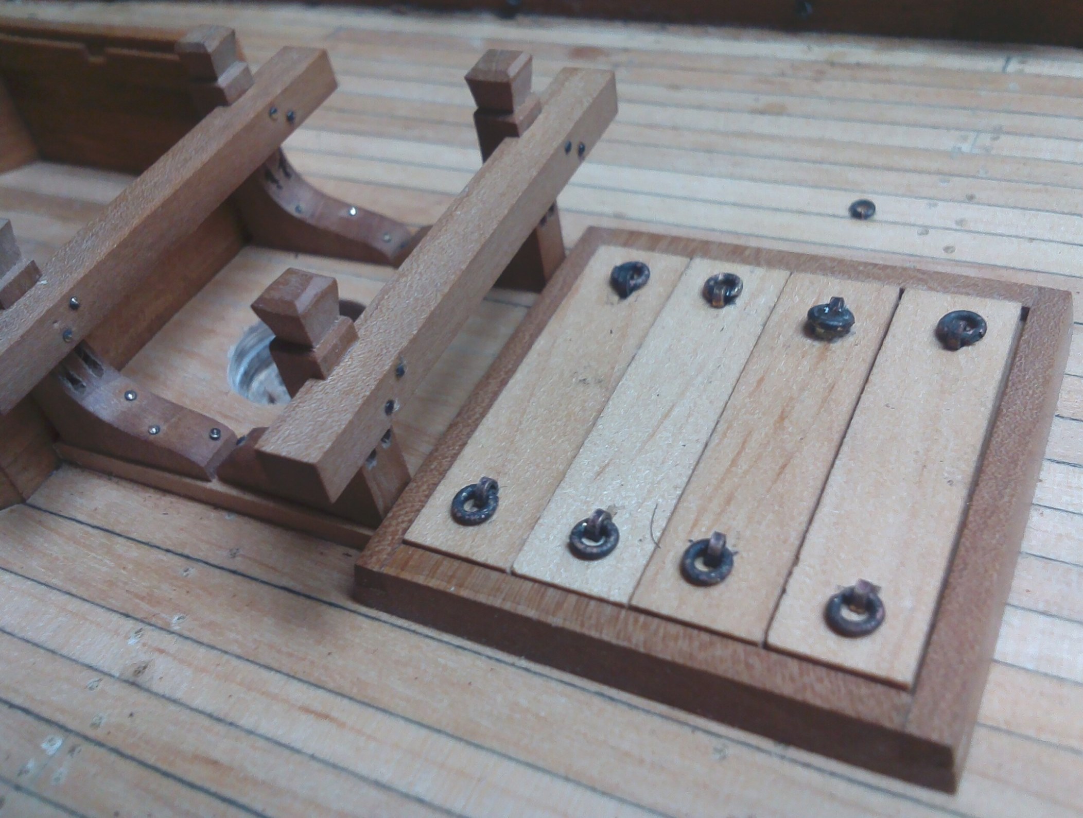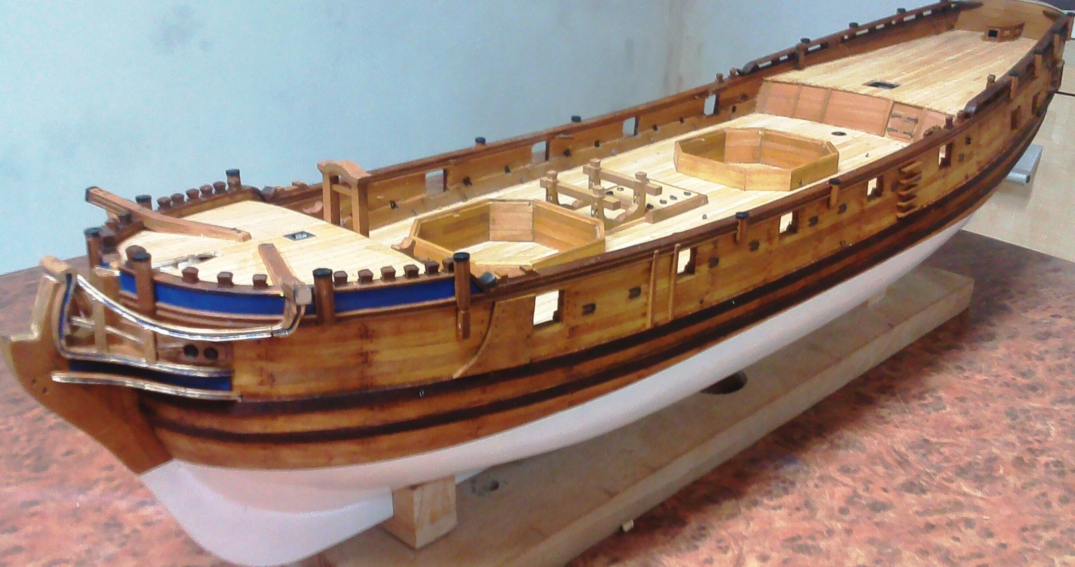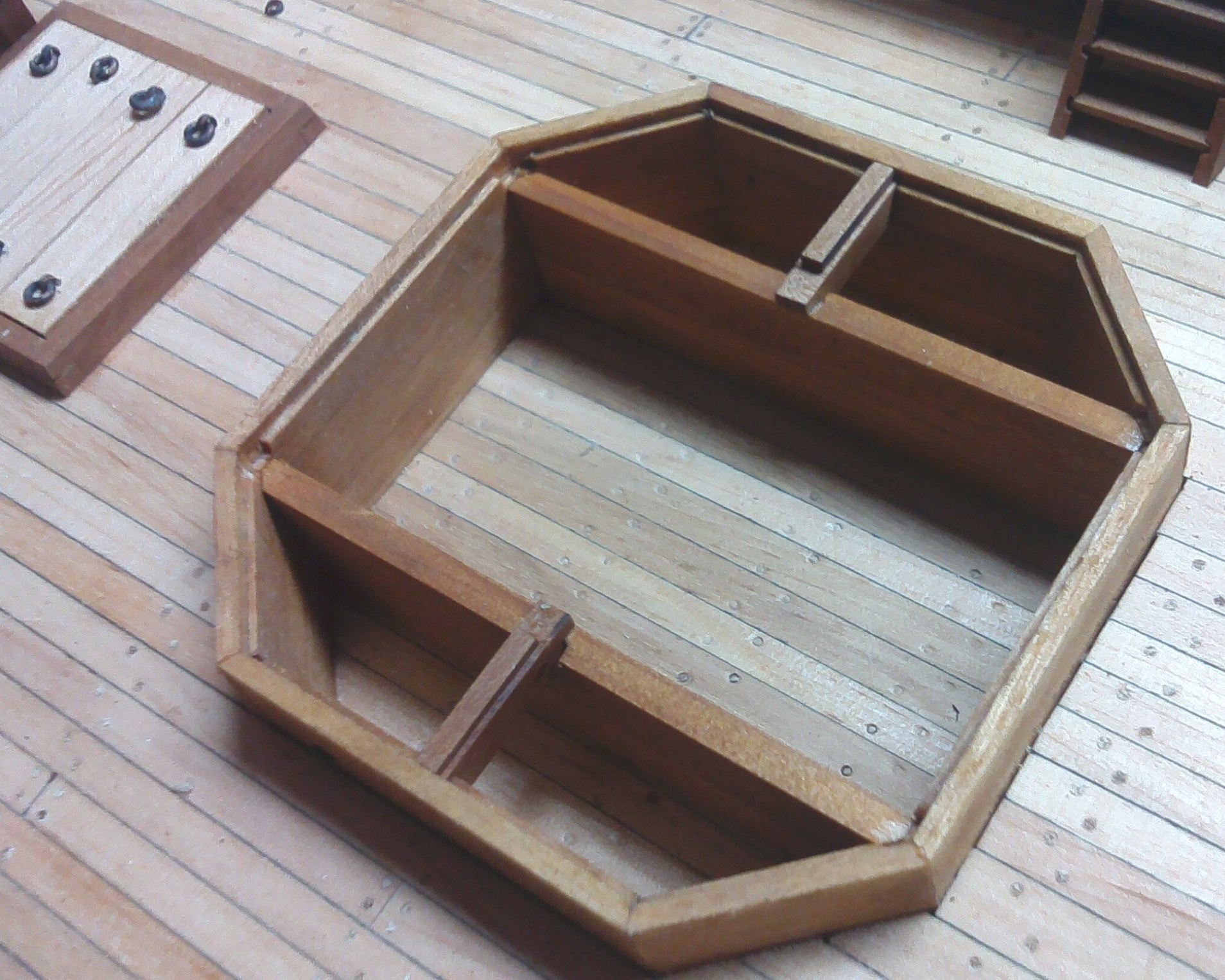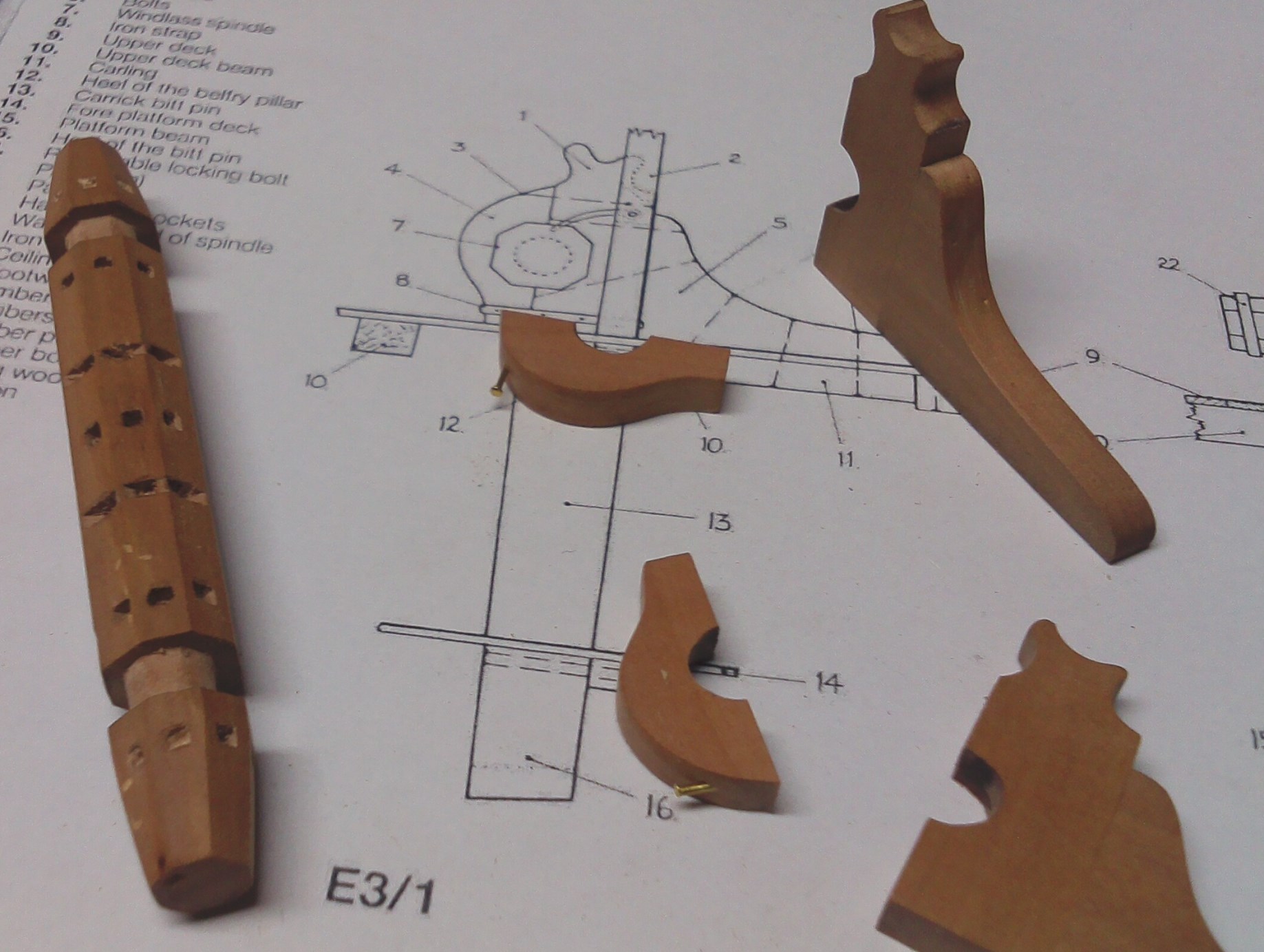 Przybyło całkiem sporo drobnych detali; pachoły, knagi, bloki itp.:Są też nieco większe szczegóły wyposażenia pokładowego; tu obudowa górnej części steru:Pachoły przymasztowe i zrębnica wraz z pokrywami:Zamontowany kabestan, brakuje jeszcze dzwonu:Kosz dziobowy. Nie jestem do końca zadowolony, ale nawet takie wykonanie kosztowało sporo pracy:Kadłub po olejowaniu nabrał innego wyrazu: