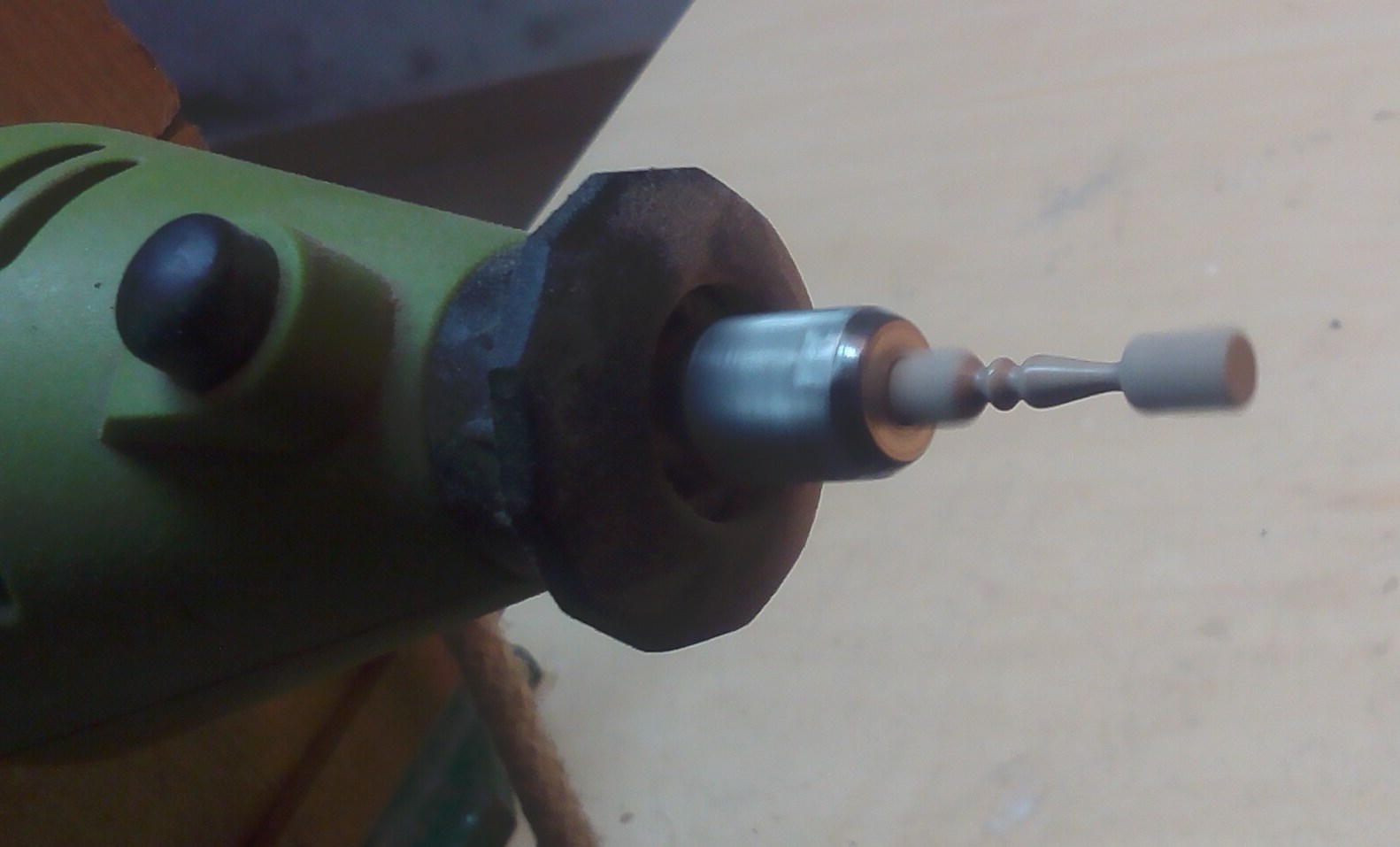 Przeglądając relacje na Kodze, zauważyłem, że niektórzy koledzy mają problem z wytoczeniem drobnych detali. Chodzi głównie o nagle. Ja wykonuję takie detale z pomocą dwóch mini wiertarek; do jednej z nich (stacjonarnej) mocuję kawałek drewna, a do drugiej (trzymanej w ręce) tarczę ścierną. Wykonany w ten sposób element poleruję drobnym papierem ściernym:Przy odrobinie wprawy można zachować powtarzalność, posługując się najdoskonalszym przyrządem pomiarowym - okiem.