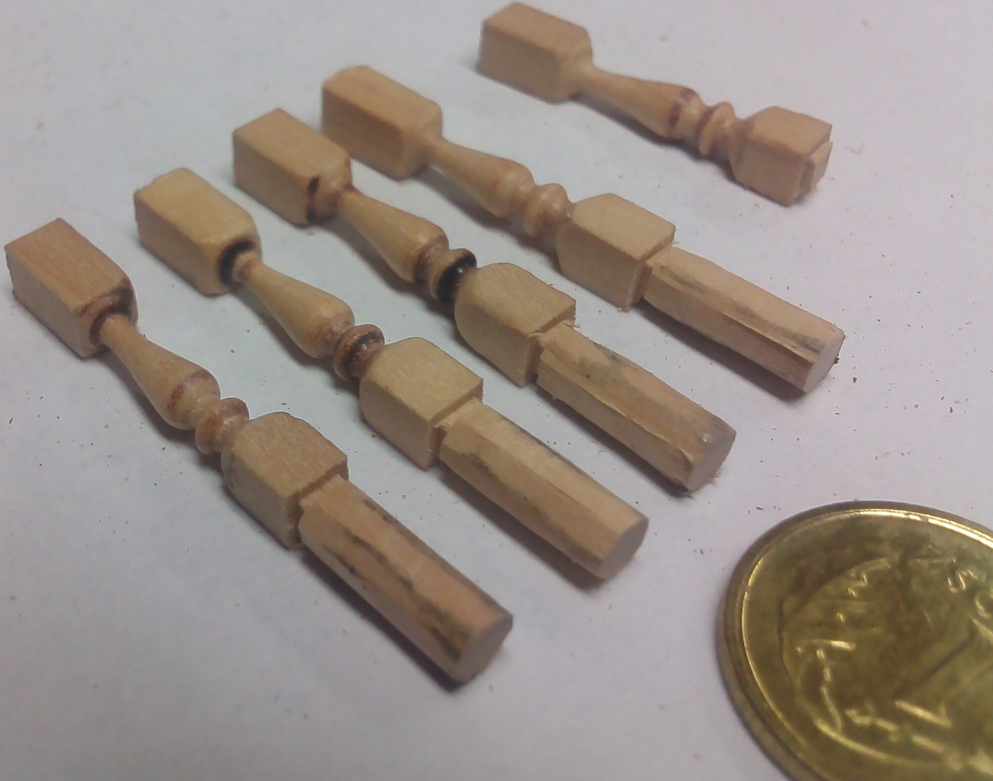 Posłużyłem się zdjęciami wykonanych w ten sposób tralek, ale zapewniam, że nagle też można tak wykonać. Polecam drewno jabłoni, które jest dość twarde, a jednocześnie elastyczne. Niewielkimi przypaleniami powierzchni się nie przejmuję, bo po bejcowaniu, nie będą widoczne:Jednak głównym moim zajęciem od kilkunastu dni są rzeźby. Masa "Green Stuff":Kupiłem onegdaj takie oto narzędzia dla plastyków. Okazały się przydatne:Jak na moje skromne umiejętności rzeźbiarskie, efekt mnie zadowala.