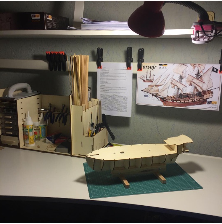 Po powitaniu w Przywitalni zachęcony wpisami doświadczonych kolegow, zaczynam relacje z budowy Korsarza z zestawu firmy OcCre. Na ten moment nie mam do pokazania wiele. Dziś zająłem się organizacją warsztatu i złożyłem wręgi ,,na sucho". Nie ma się czym chwalić ale od czegoś trzeba zacząć