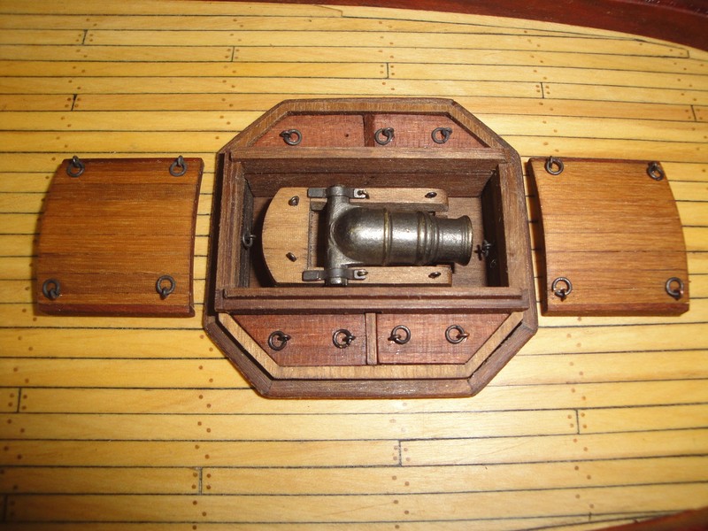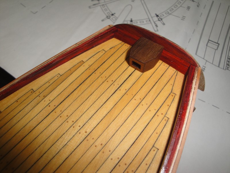 Pociagnalem kadlub olejem lnianym i od razu nabral cieplego koloru. Przymiezylem sie do mozdzieza. Nie jestem 100%owo pewny, czy te uchwyty przy lawecie mozdzieza nie sa za cienkie? Co o tym sadzicie? Zalozylem porecze (?) na burty no i w koncu zagwozdziowalem odbojnice.
