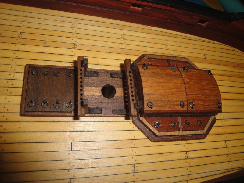 Pociagnalem kadlub olejem lnianym i od razu nabral cieplego koloru. Przymiezylem sie do mozdzieza. Nie jestem 100%owo pewny, czy te uchwyty przy lawecie mozdzieza nie sa za cienkie? Co o tym sadzicie? Zalozylem porecze (?) na burty no i w koncu zagwozdziowalem odbojnice.