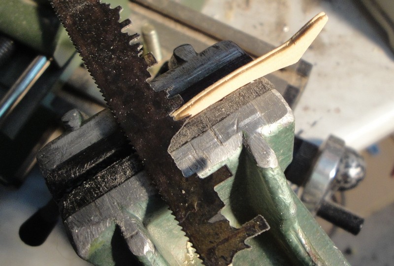 Pomalu przybywa coraz wiecej drobiazgow: knagi, pacholki, drabinki itp. Przymierzylem sie do kosza dziobowego (pierwszy etap). Elementy wykonalem z bukszpanu, rowki skrobalem profilem wycietym w brzeszczocie pily do metalu.
