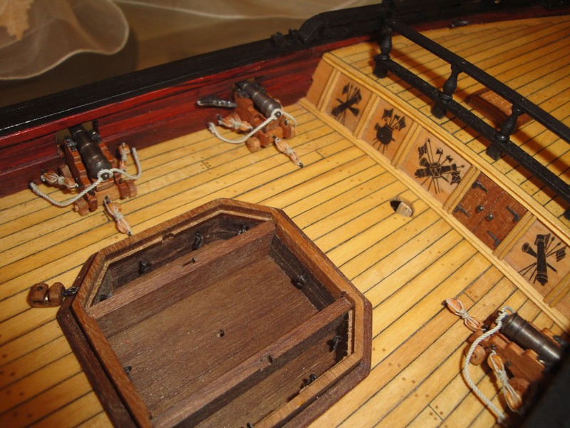 Artyleria zlozona do kupy. I tu zostalem skonfrontowany z czestym problem przy budowie modeli: notorycznym brakiem miejsca na pokladzie. Stwierdzilem, ze jesli dam pelne olinowanie lawet (oczko, haczyk, bloczek, linka),to nie bede mial miejsca na tylne zamocowanie lawet (stanowiska mozdziezy przeszkadzaja). Albo zrezygnuje z tylnego mocowania (raczej nie typowe rozwiazanie przy mocowaniu dzial), albo dam sobie spokoj z haczykami (zyskam 6-8mm), i bede mial cicha nadzieje, ze po maksymalnym przysunieciu dzial do burty i zamocowaniu bloczkow bezposrednio na oczkach wyrobie sie z miejscem na tylne mocowanie.