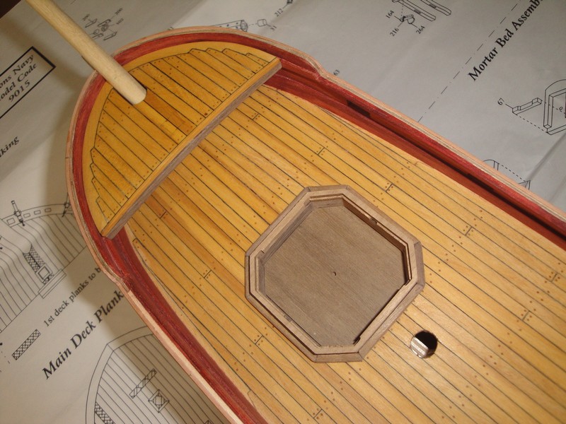 Pociagnalem kadlub olejem lnianym i od razu nabral cieplego koloru. Przymiezylem sie do mozdzieza. Nie jestem 100%owo pewny, czy te uchwyty przy lawecie mozdzieza nie sa za cienkie? Co o tym sadzicie? Zalozylem porecze (?) na burty no i w koncu zagwozdziowalem odbojnice.