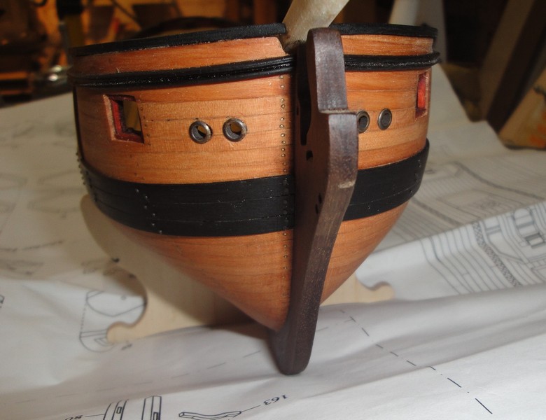 oczywiscie Mati masz swieta racje, na kazda wrege przychodzil rzad gwozdzi, dziekuje za konstruktywna krytyke, ale: ja nie poszedlem na latwizne, swiadomie dalem tyle ile jest. Model jest w skali 1:64 co rezultuje w dlugosci kadluba ok. 50cm. Przy ca. 50 wreg, daje to jeden rzad gwozdzi obok drugiego. W konstrukcji kadluba w zestawie bylo 9 pseudo wreg. Poszedlem na kompromis i dalem gwozdzie co trzecia wrege: w sumie 16 rzedow. Tak mi to optycznie odpowiada i niech tak to juz zostanie, pomimo ze nie jest to zgodne z historyczna rzeczywistoscia.