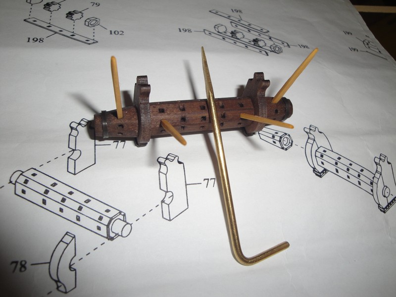 Wiekszosc elementow przejalem z zestawu, tylko kabestan wystrugalem na nowo, bo ten z zestawu byl makabryczny. Metamorfoza otworow okraglych (wiertlo 1,5mm) na kwadratowe zostala wykonana przy pomocy takiego skomplikowanego ustrojstwa :) (szpikulec czworokatny).