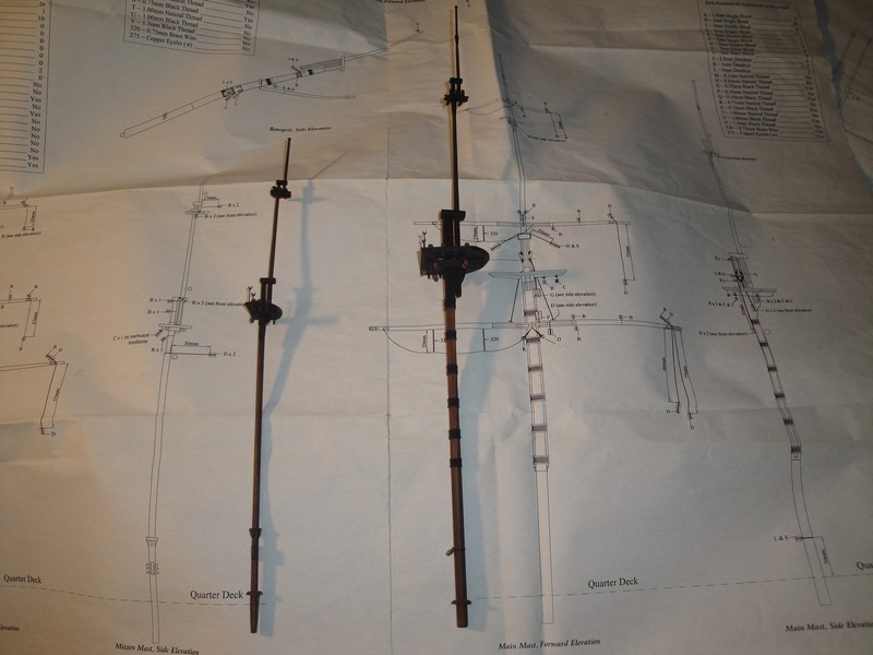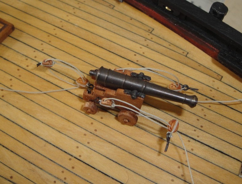 Artyleria zlozona do kupy. I tu zostalem skonfrontowany z czestym problem przy budowie modeli: notorycznym brakiem miejsca na pokladzie. Stwierdzilem, ze jesli dam pelne olinowanie lawet (oczko, haczyk, bloczek, linka),to nie bede mial miejsca na tylne zamocowanie lawet (stanowiska mozdziezy przeszkadzaja). Albo zrezygnuje z tylnego mocowania (raczej nie typowe rozwiazanie przy mocowaniu dzial), albo dam sobie spokoj z haczykami (zyskam 6-8mm), i bede mial cicha nadzieje, ze po maksymalnym przysunieciu dzial do burty i zamocowaniu bloczkow bezposrednio na oczkach wyrobie sie z miejscem na tylne mocowanie.