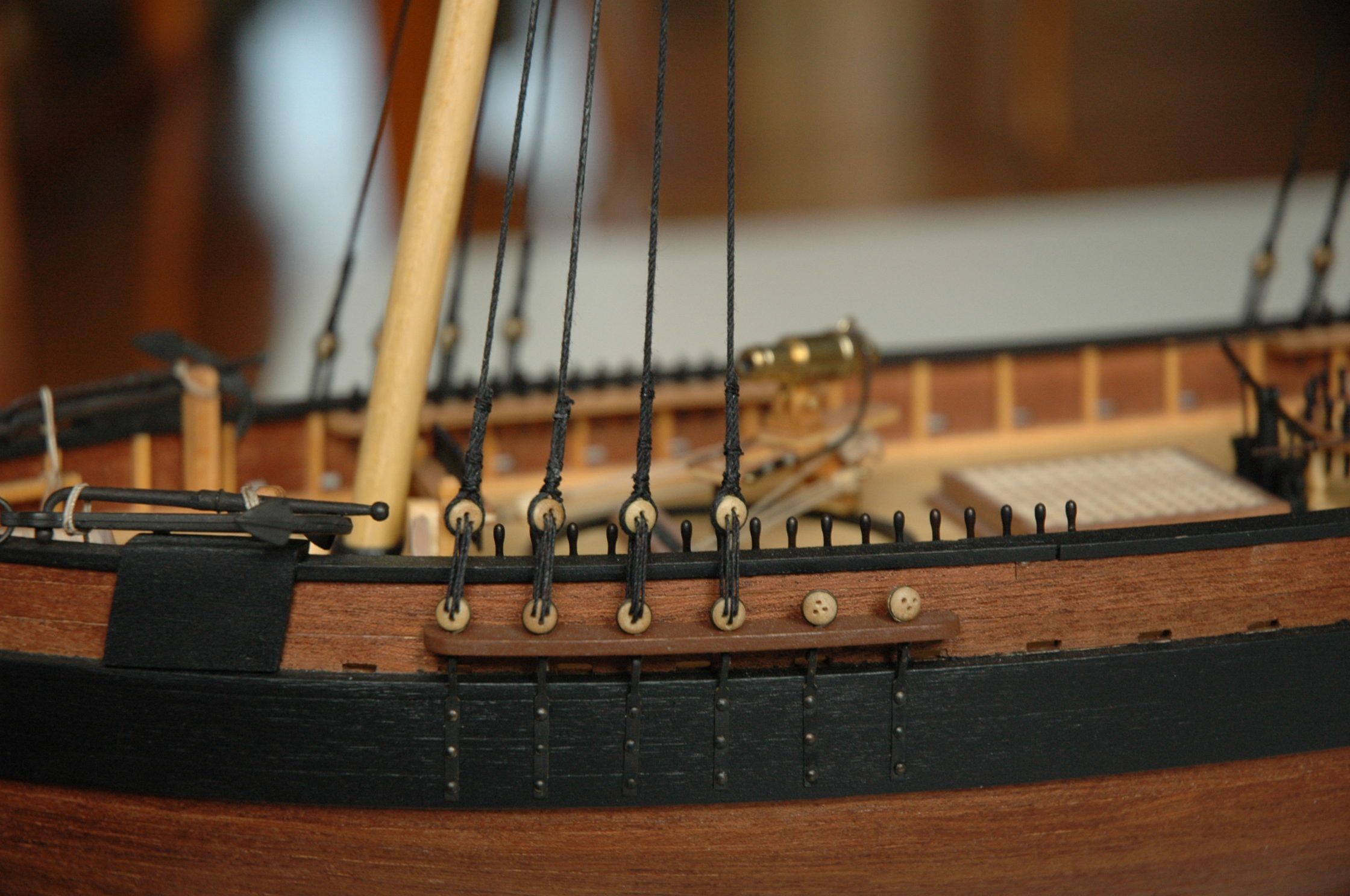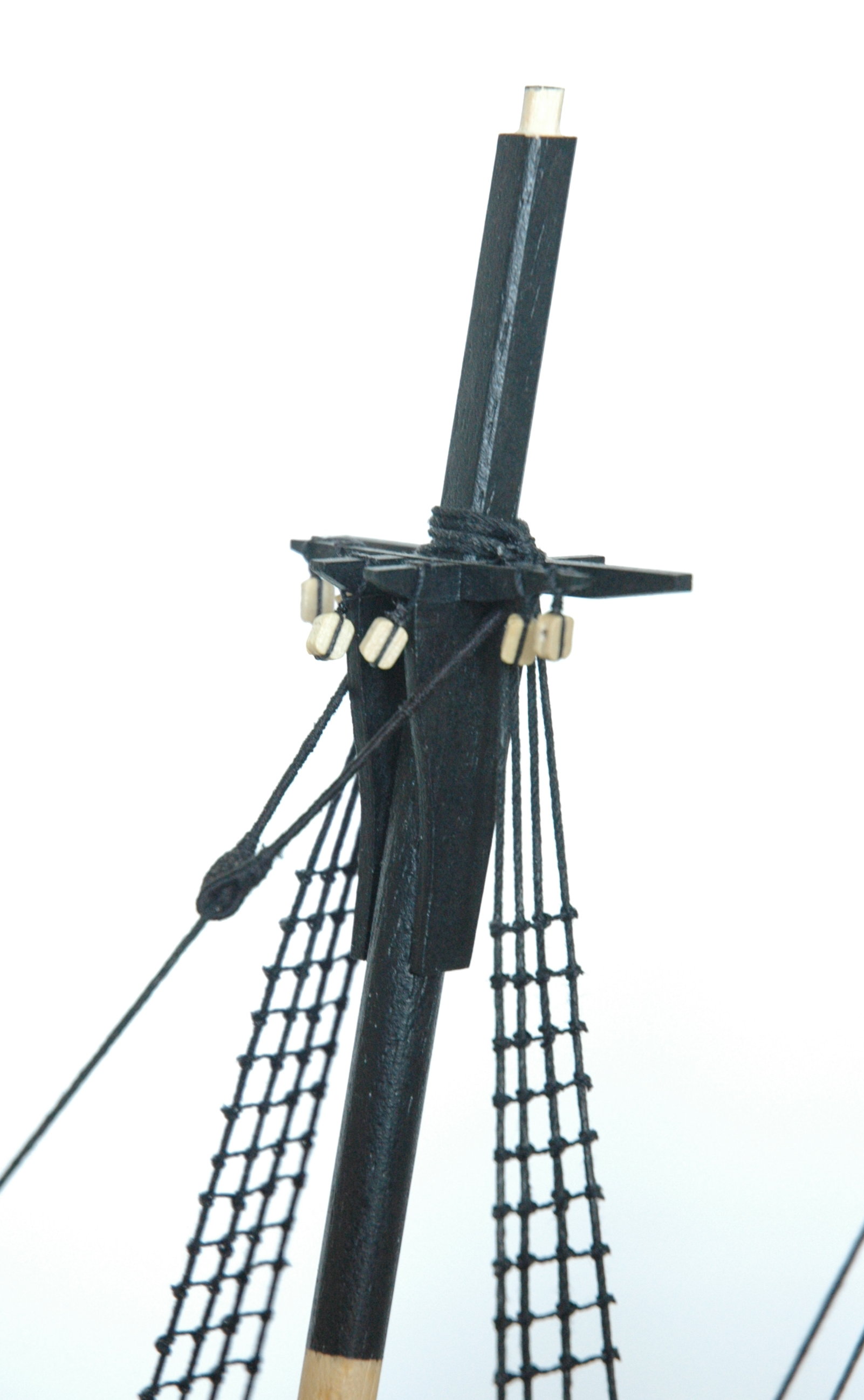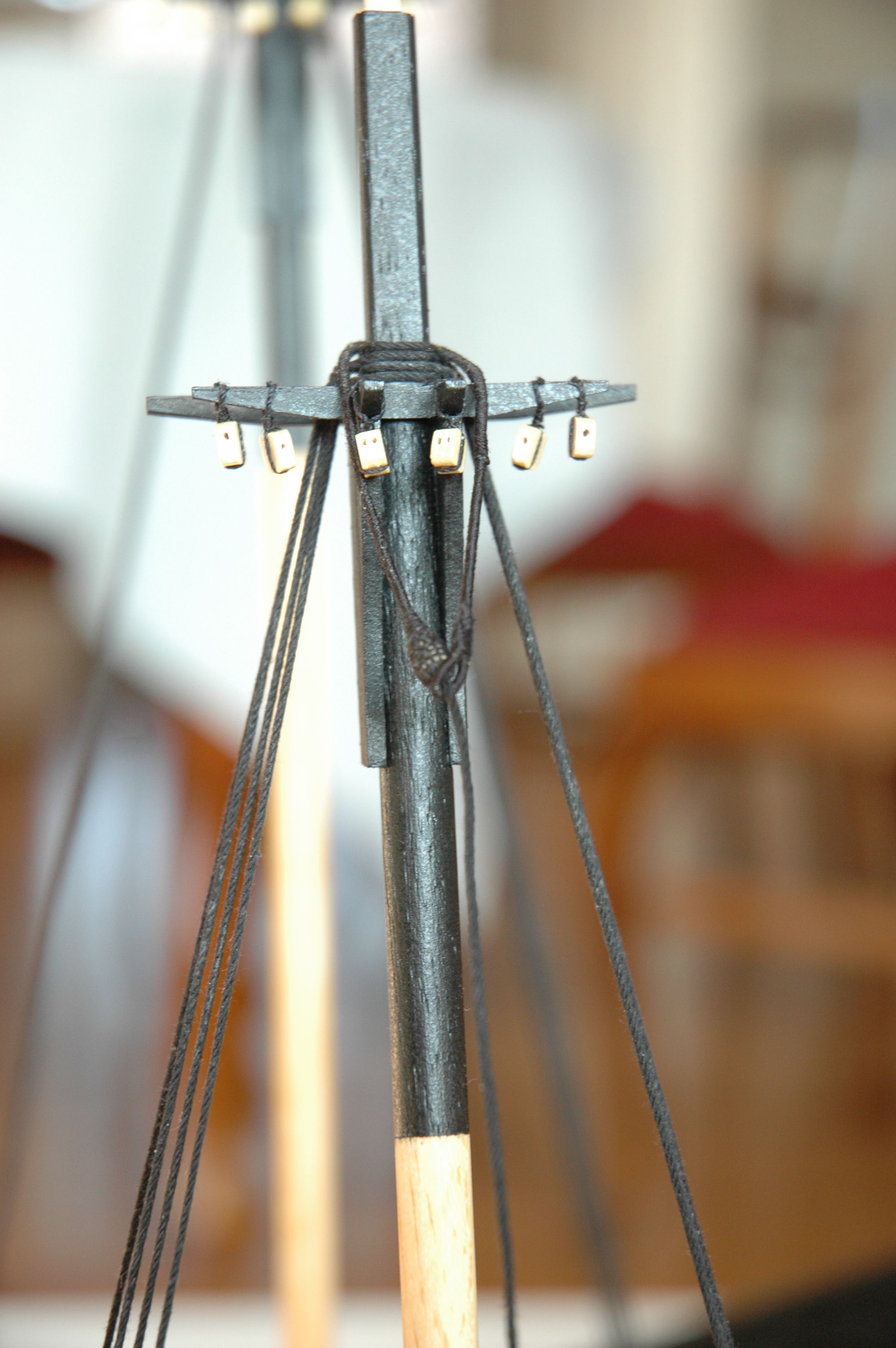 Po dłuższej przerwie zamocowałem kolumny masztów oraz zacząłem wykonywać olinowanie stałem, wanty. Teraz studiuję archiwa kogi aby zgłębić jak wykonać gałkę turecką i zamocować sztagi.