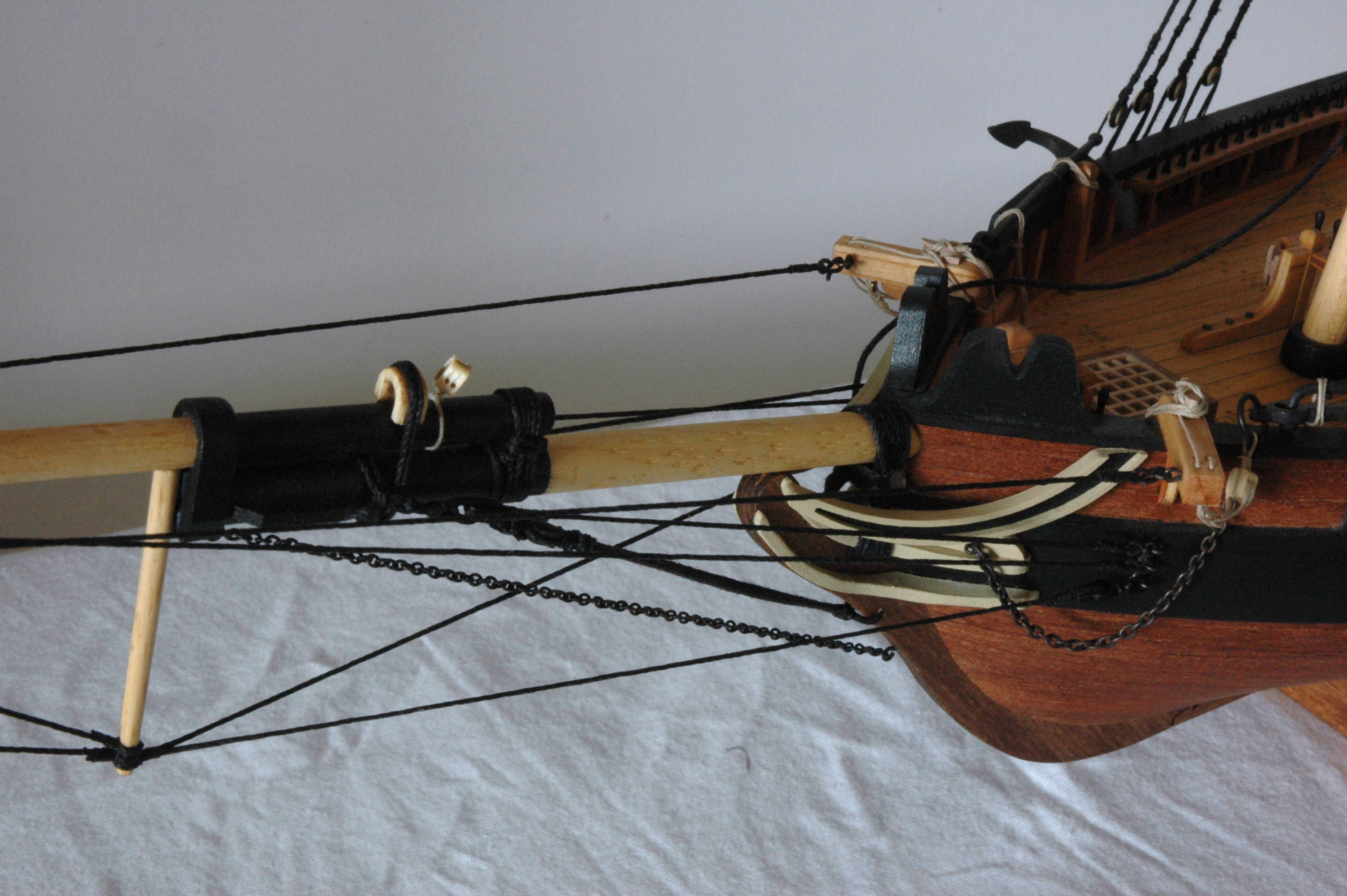 A nie widzisz na tym zdjeciu, w srodku tych pionowych oplotow owego wiazania (ang. crupper), inne wiazanie biegnace prostopadle do tych pionowych, miedzy jibbom'em a bowsprit'em? Wiazanie to dodatkowo zaciska te pionowe petle, bo sciaga razem je wszystkie ku srodkowi, usztywniajac polaczenie obu belek.