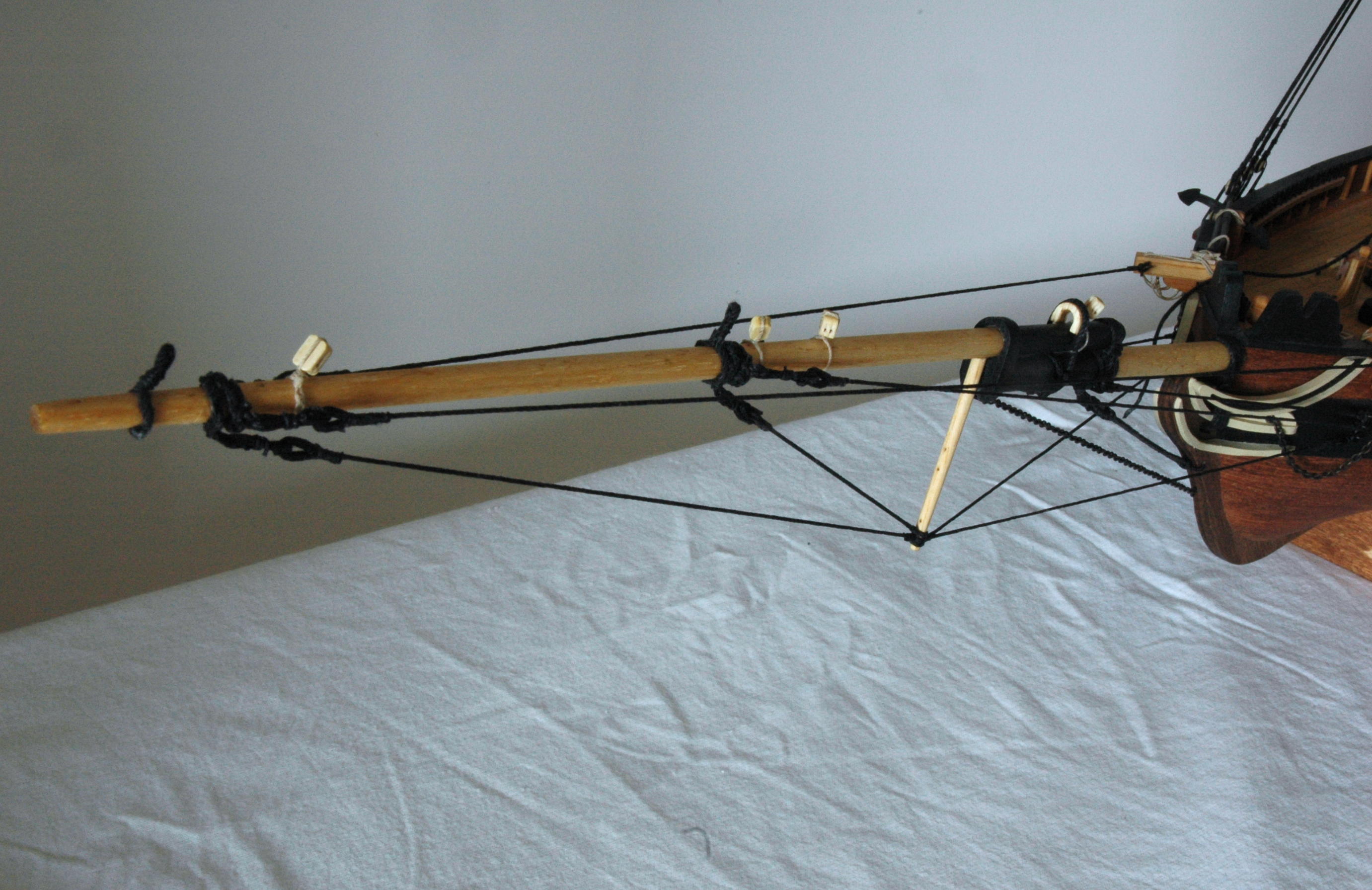 Jesli skala (wielkosc) Twego modelu nie pozwoli na to, to zrob jak to jest na zwyklym bowsprit gammoning, tj. okrec koniec nitki wokol tych pionowych wiazan na wysokosci miedzy w/w belkami, zaciskajac te wiazanie.
