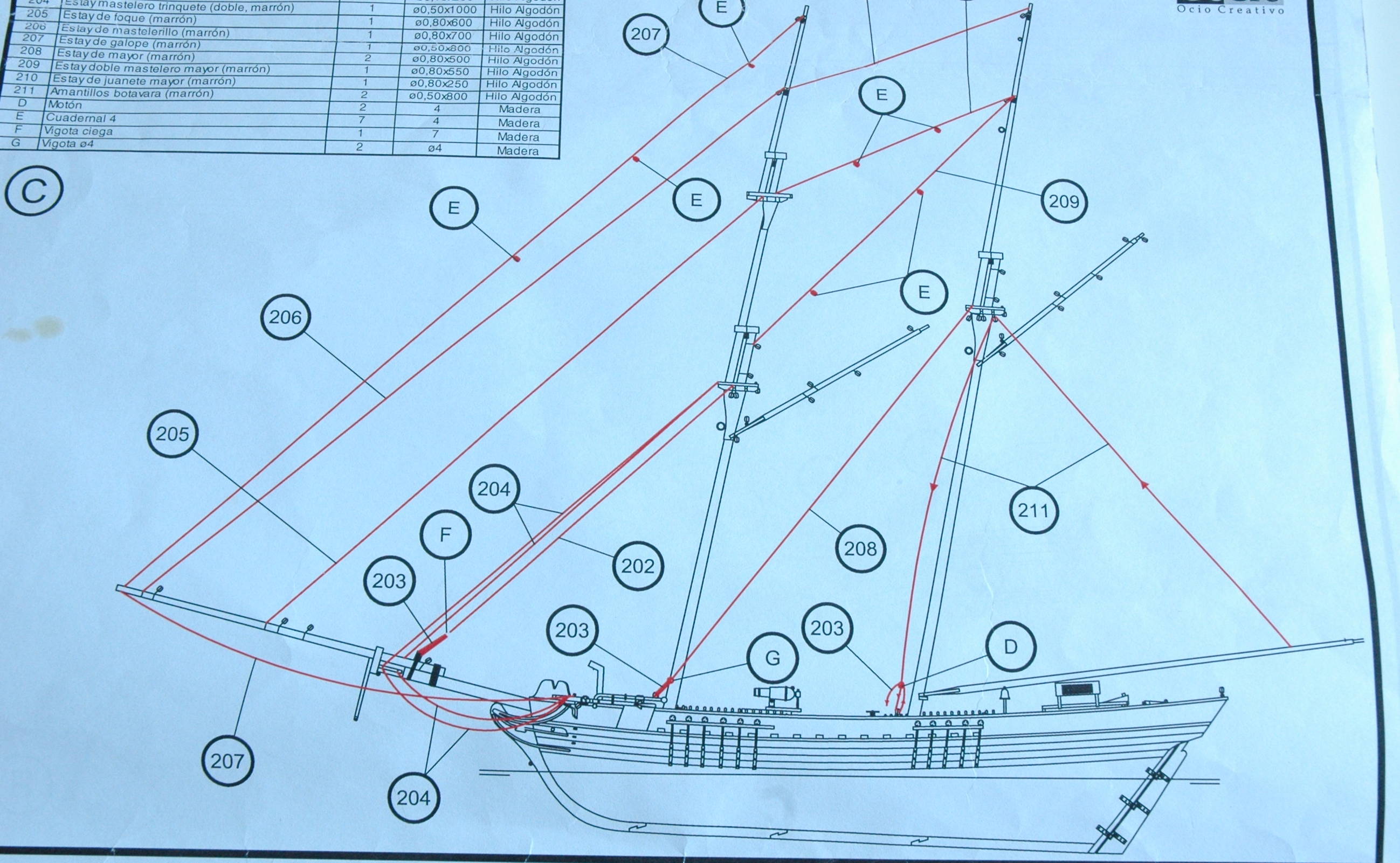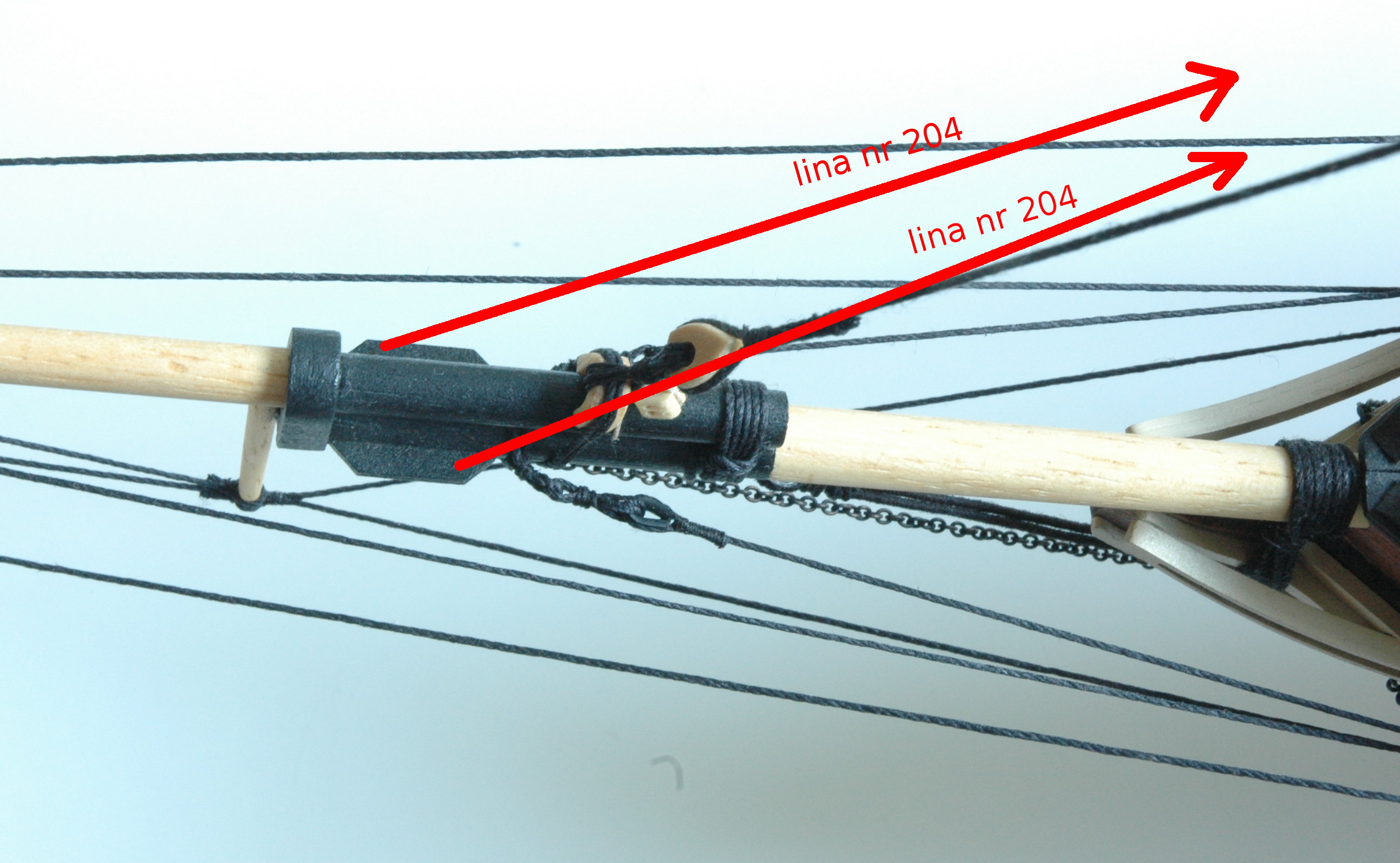 Wykonałem wyblinki na wantach,... żmudna robota. Zamocowałem też wstępnie sztagi. Mam wątpliwość odnośnie liny nr 204 widocznej na zdjęciu strony z instrukcji oraz oznaczonym jej przebiegu na zdjęciu bukszprytu. Najpierw myślałem że powinna być obłożona na kolumnie masztu jak sztagi ale w instrukcji poprowadzili ją w inne miejsce, tylko na czym powinna się ona zawinąć? Swoją drogą nie wiem jaką nazwę nosi ta lina. Będę wdzięczny za podpowiedzi.
