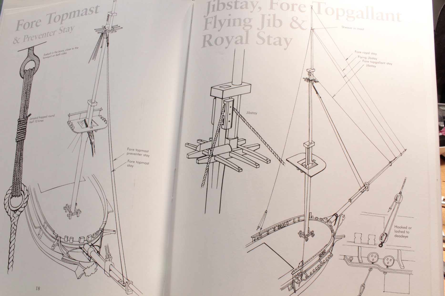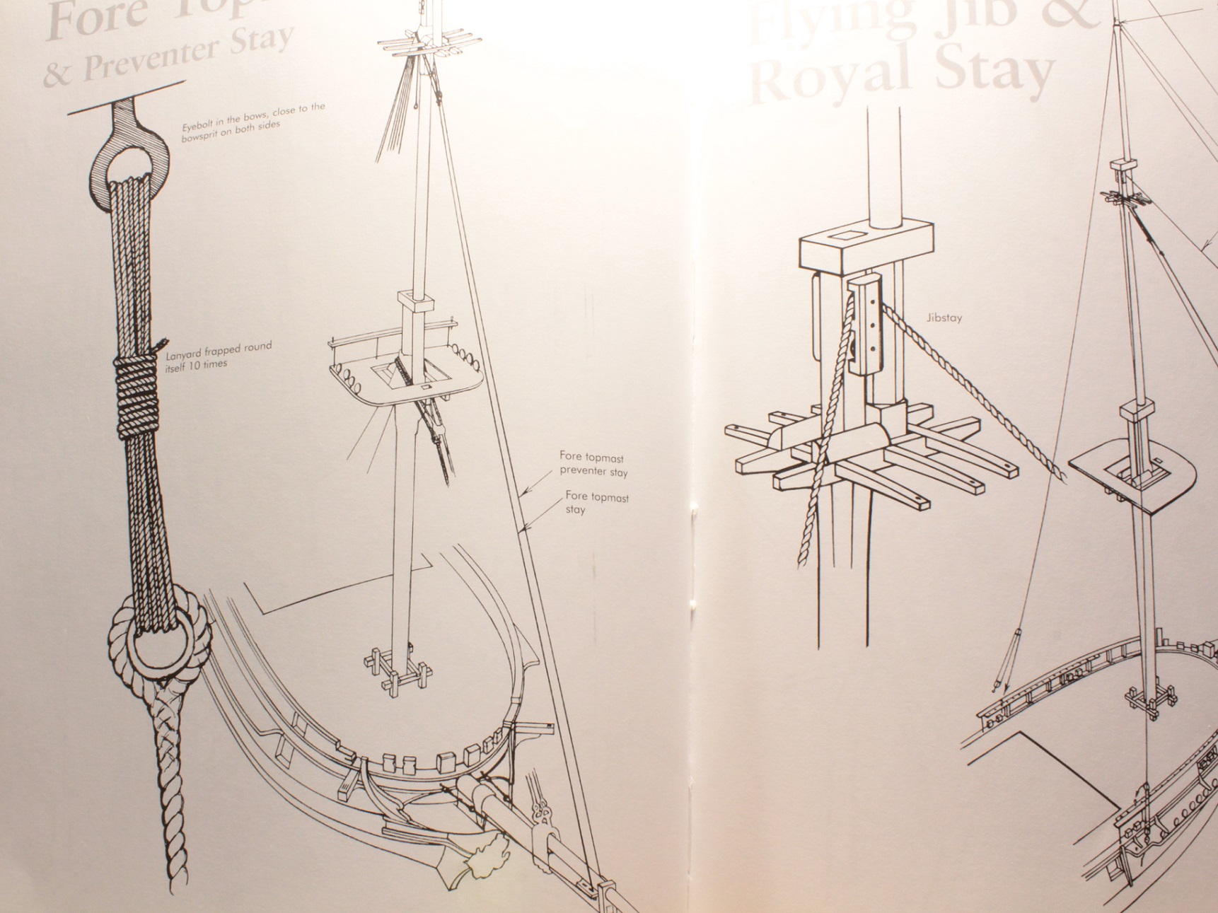 Wygląda na to, ze po naszemu to sztagi stengi fokmasztu. Sztag główny i pomocniczy. Poniżej masz mocowanie z angielskich jednostek XVIII-XIX/XX w. Fotki z książki Rigging autor Lennarth Petersson