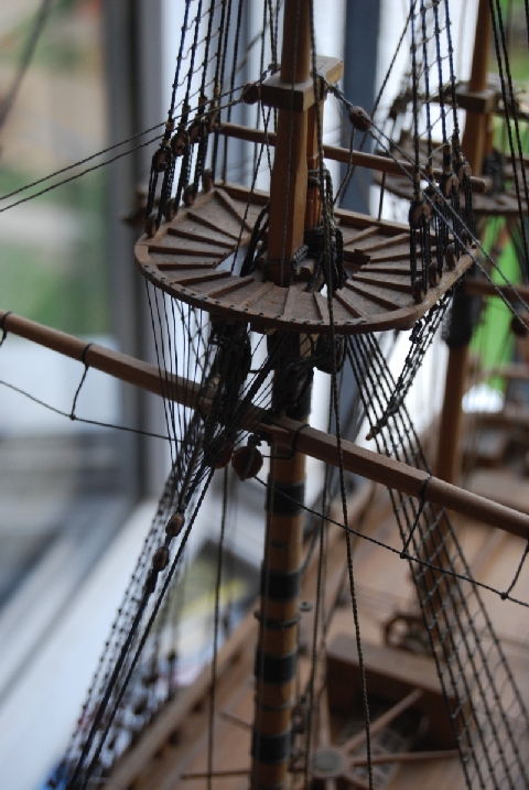 Brak uzbrojenia i olinowania górnych rei , olinowania rej bukszprytu i olinowań kierunkowych rej, malowanie dna do poprawki , gdzieś mam kotwice, skończyły się bloczki. Detale typu pourywane linki odklejony zawias steru itp , naprawione.