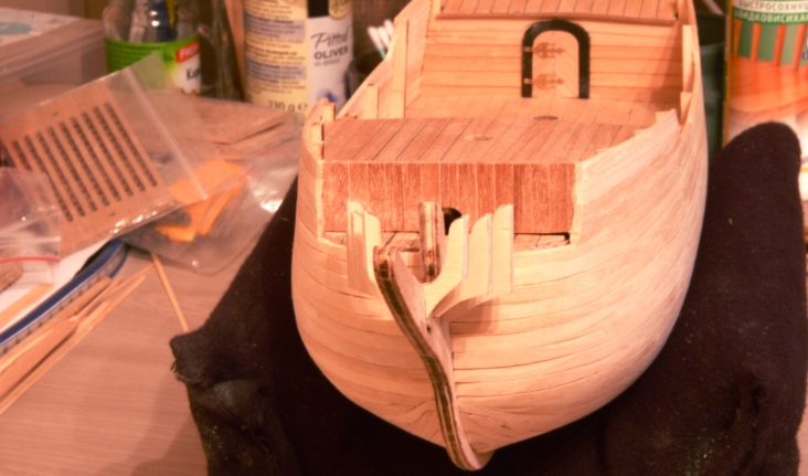 Na dziobie, na podłużnicy, po obu stronach nakleję chyba jakieś drewniane elementy. Będzie do czego przymocować początkowe planki.