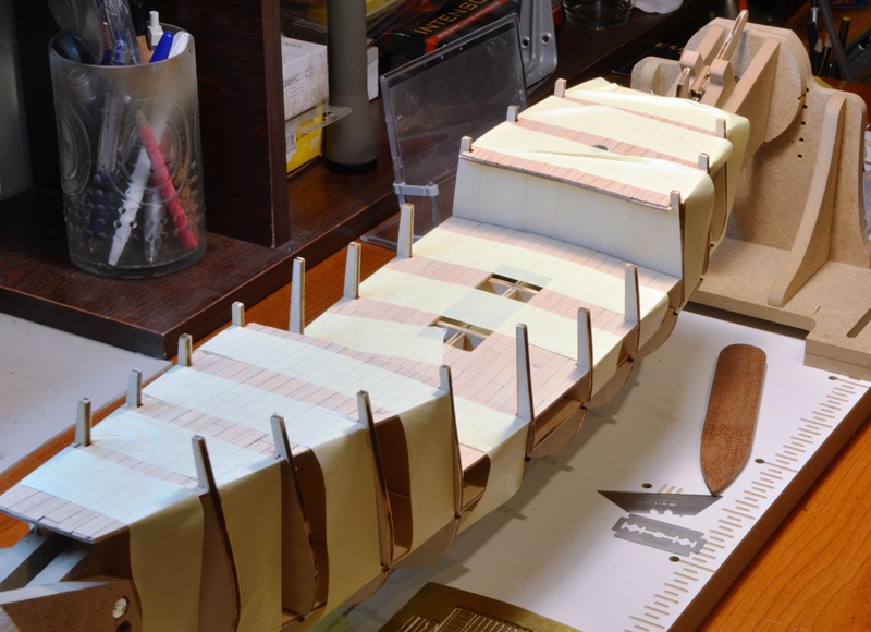 Okleiłem pokłady listwami. Próbowałem różnego drewna i różnych myków na imitację uszczelnień i sposobów cyklinowania. Zaczynam stosować techniki, z którymi lepiej mi idzie.