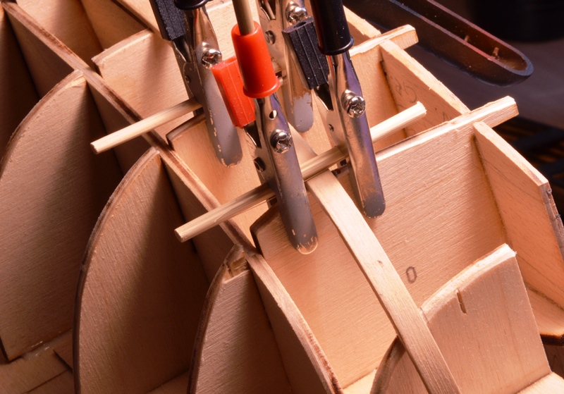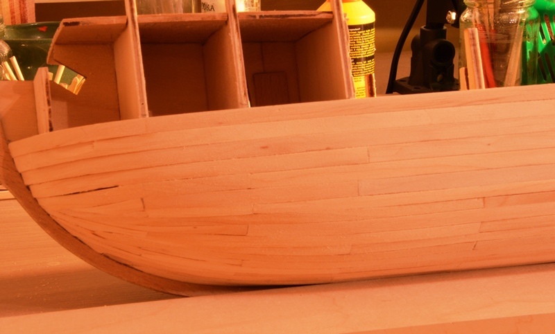 Patrząc od stępki, w żadnym wypadku nie ciągnijcie pierwszych listewek za daleko w stronę stewy rufowej. Te listewki im będą krótsze tym lepiej dla nas.