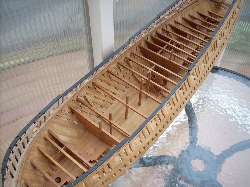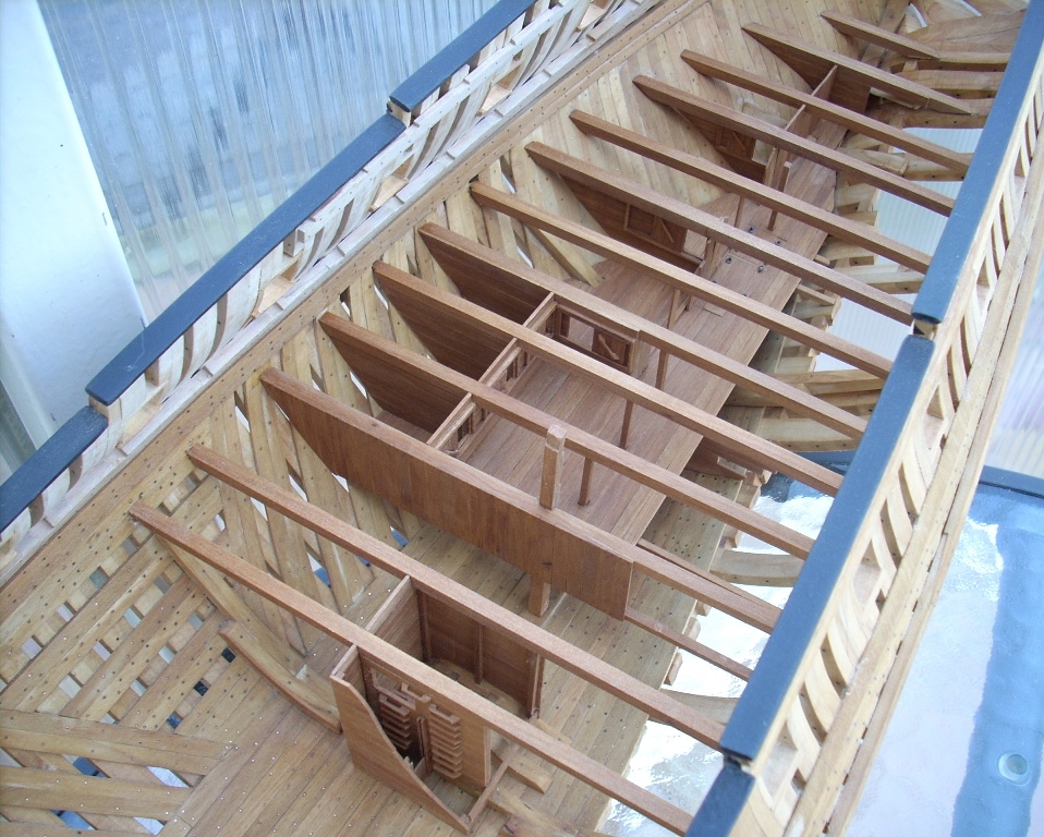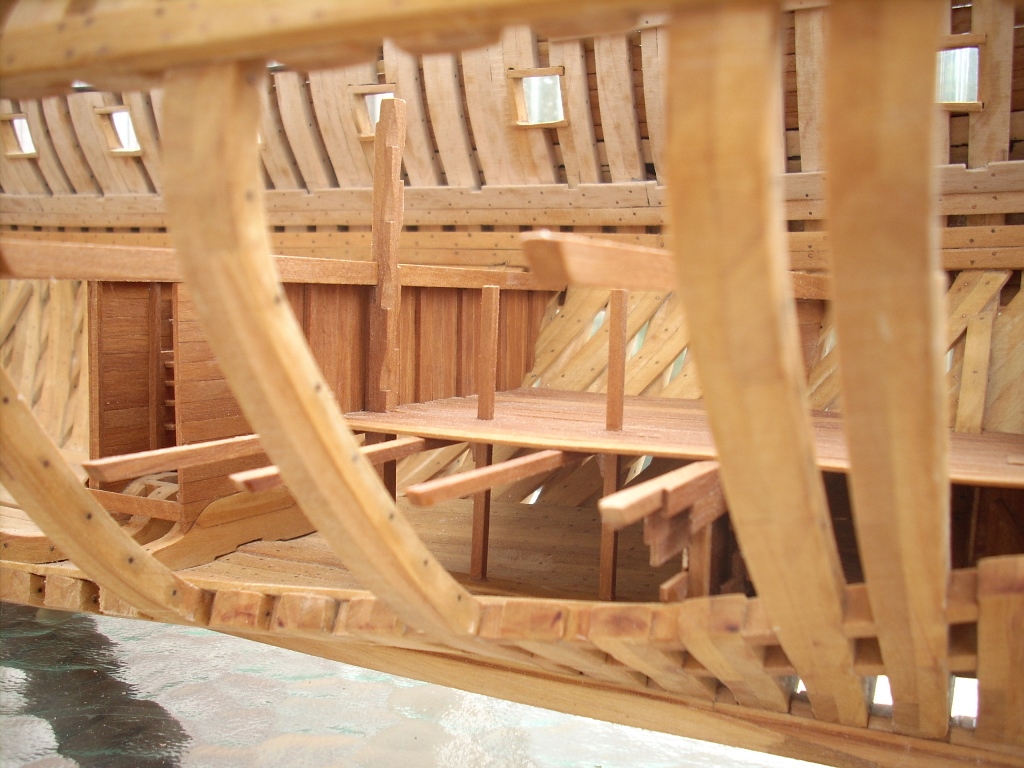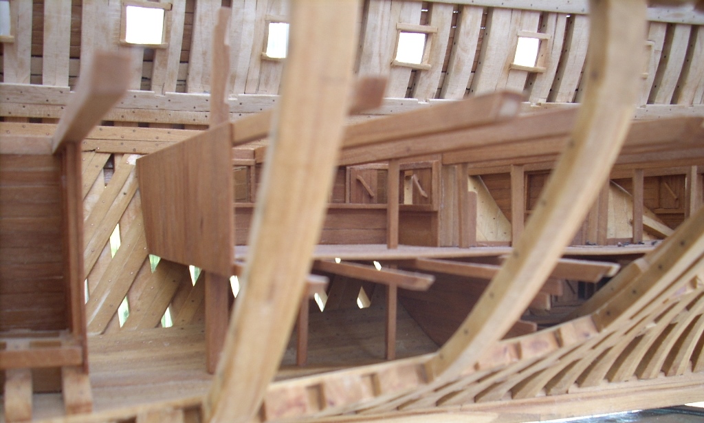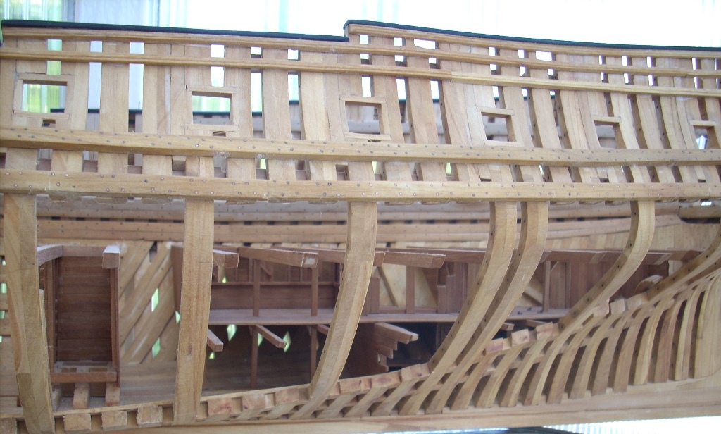 Ja trochę żałuję, że nie porobiłem takich wycięć w jednej burcie, by lepiej uwidocznić wnętrze kadluba w mym modelu i wszystkie tam detale, bo przez szpary między wręgami i przez częsciowo poszyte pokłady widoczność w głąb jest dość ograniczona. A szkoda, bo pracy tam było mnóstwo!