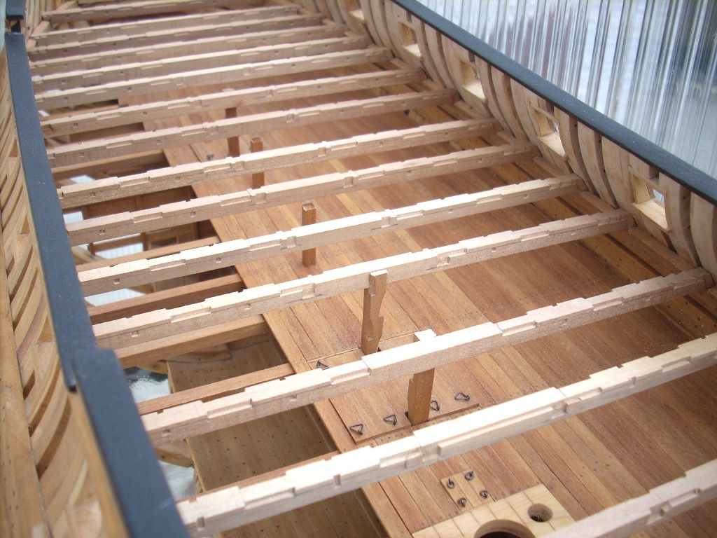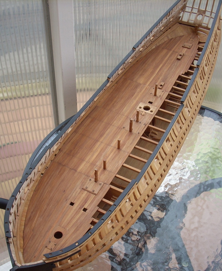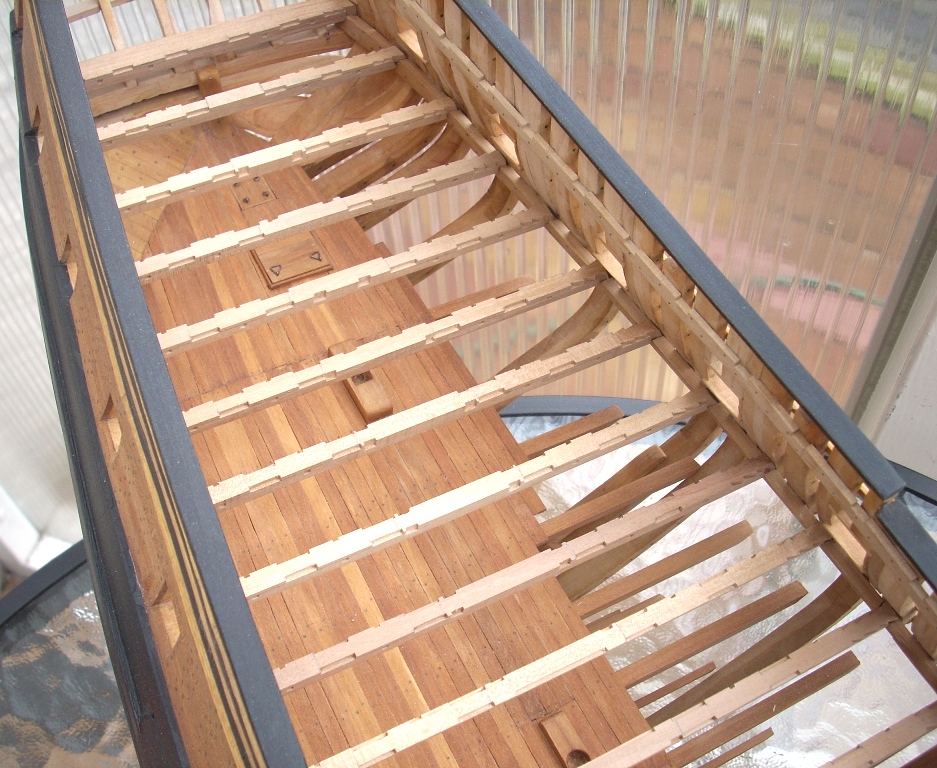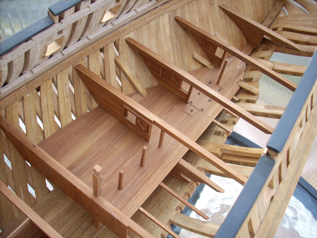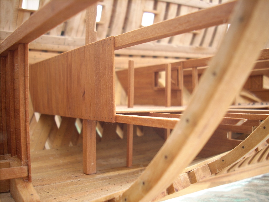 Ja trochę żałuję, że nie porobiłem takich wycięć w jednej burcie, by lepiej uwidocznić wnętrze kadluba w mym modelu i wszystkie tam detale, bo przez szpary między wręgami i przez częsciowo poszyte pokłady widoczność w głąb jest dość ograniczona. A szkoda, bo pracy tam było mnóstwo!