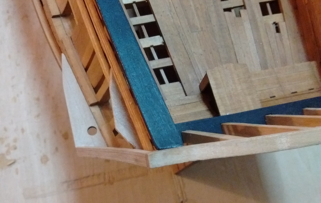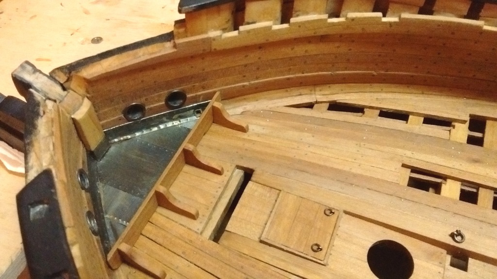 La Gatte -czyli zabezpieczenie pokładu przed ściekającą wodą z liny wciągającej kotwicę pod tą blachą deski były uszczelniane i smołowane. Blaszka mosiężna 0,15mm