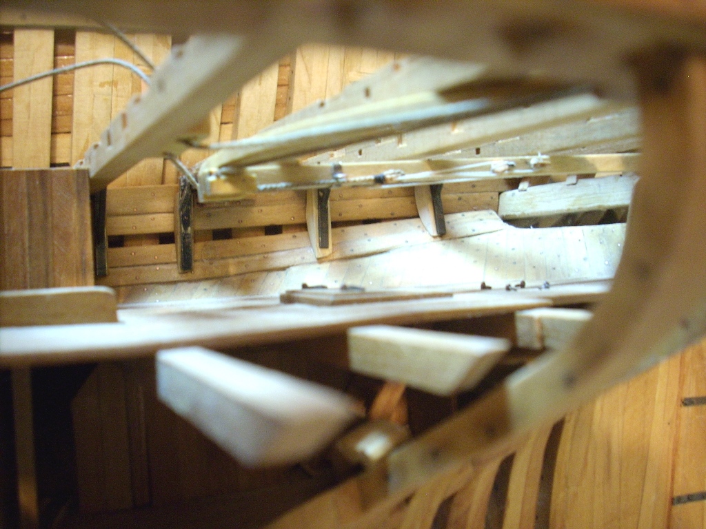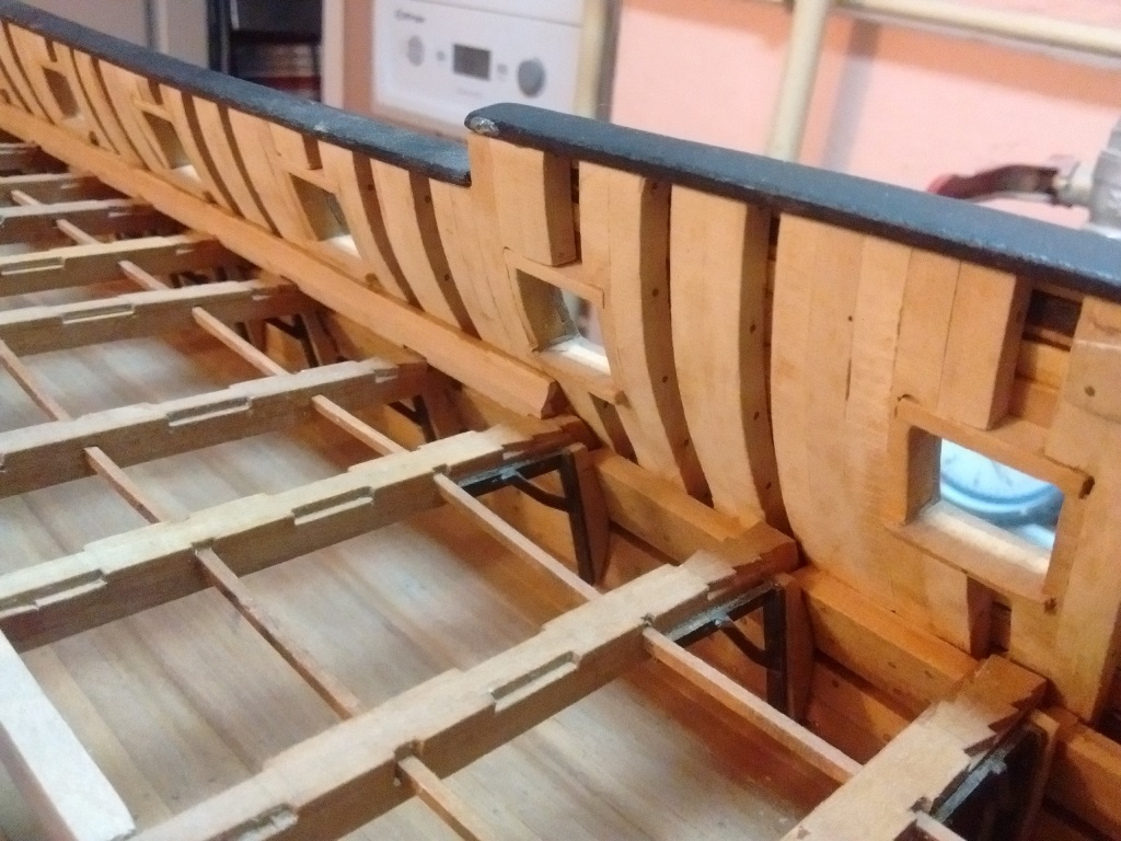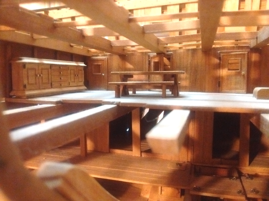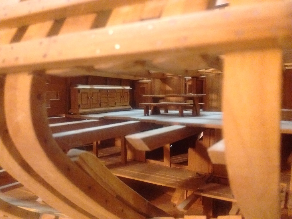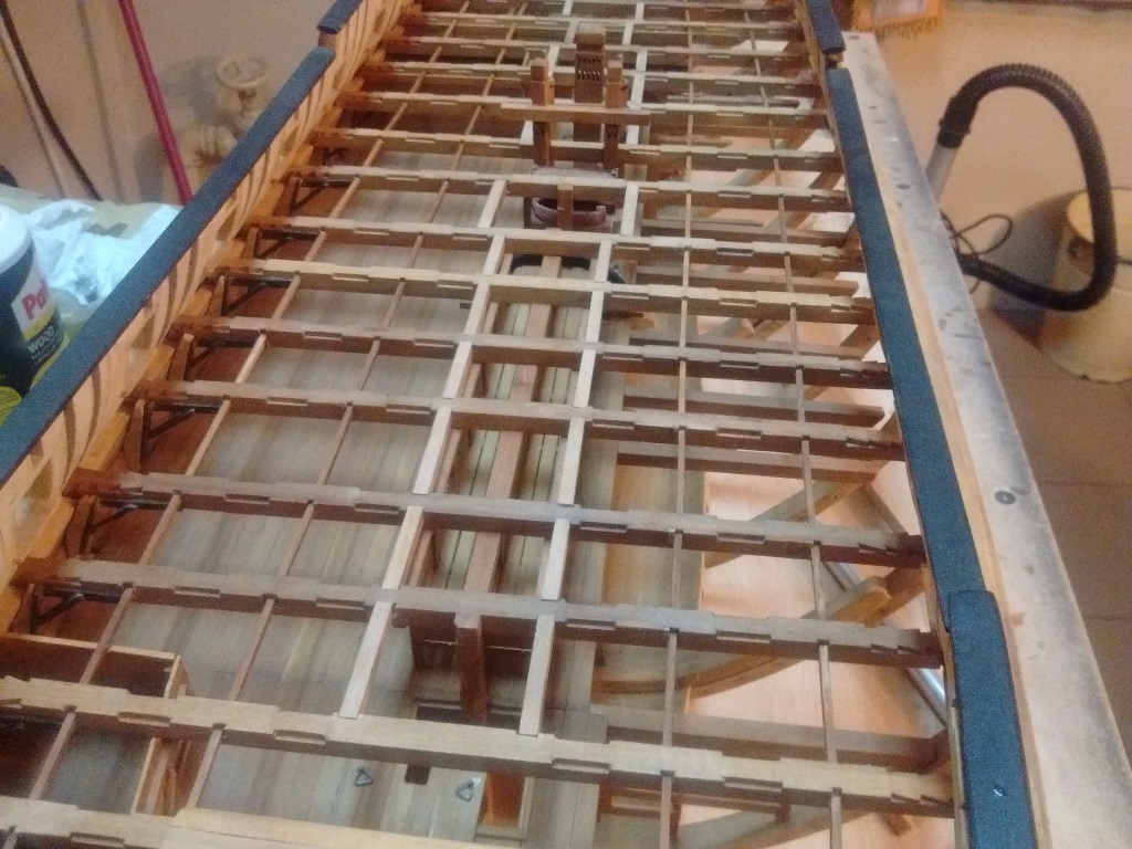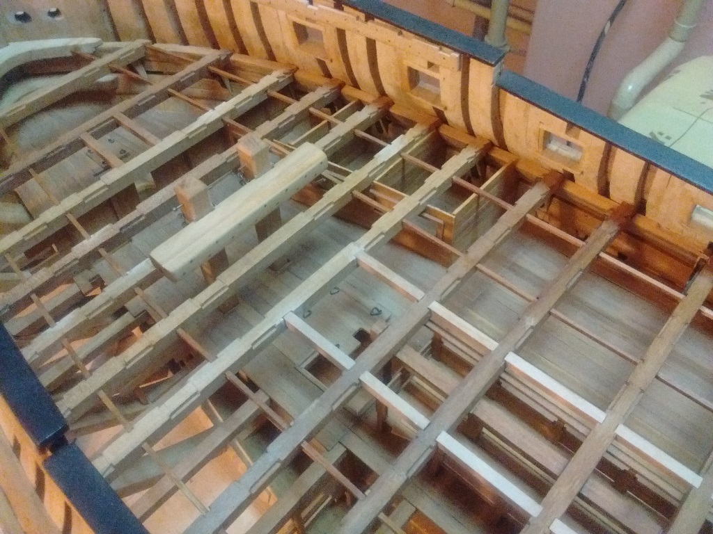 doszły kolejne belki wzmacniające na których będą ułożone deski wyrównujące poziom pokładników dla lepszego i stabilniejszego układania desek pokładowych oraz wstawiłem kilka mebelków