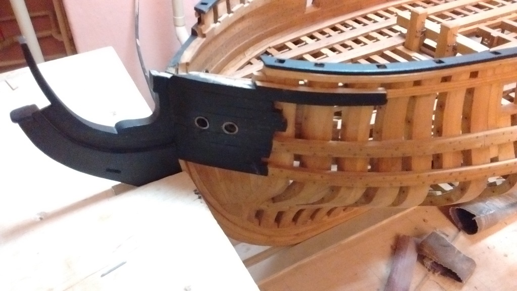 trochę kołkowania pokładu zrobiłem oraz kluzy kotwiczne i otwory odpływowe