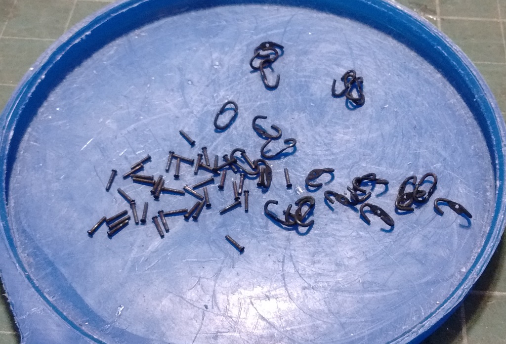 trzpienie do oski kół to drut miedziany 0,5mm oraz próba wykonania śruby pręt mosiężny 1.5mm wytoczona podkładka i śruba a końcówka lekko zeszlifowana by imitowała nakrętkę wygląda to tak sobie ale po kilku próbach będzie ok mam do zrobienia takich około 60 szt więc wprawy nabiorę :D