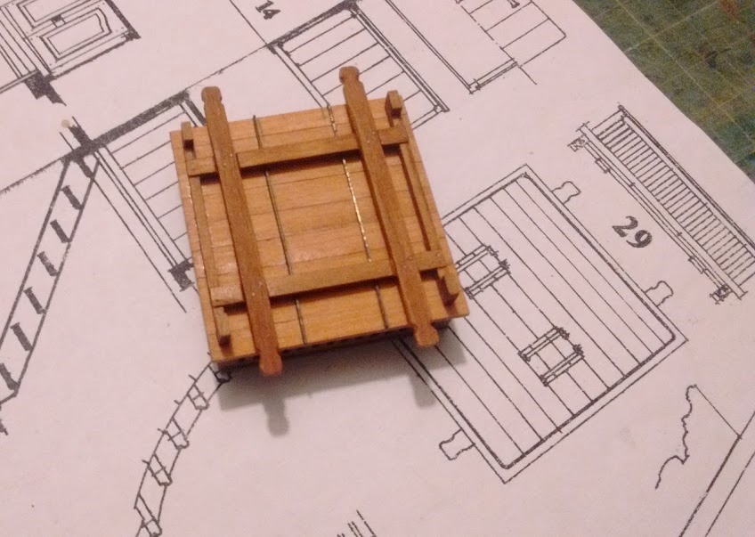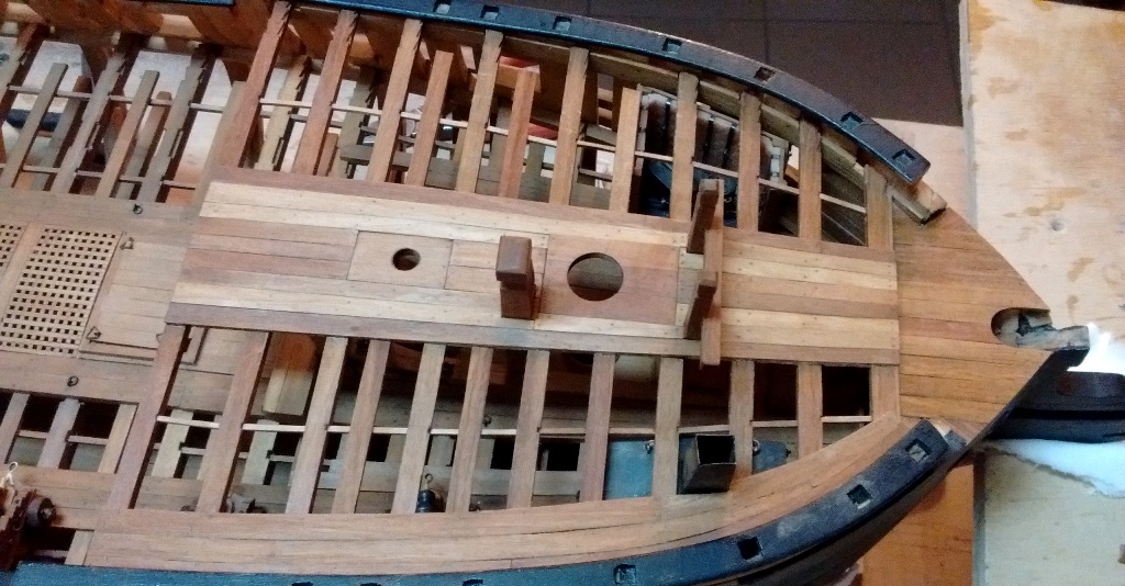 Może tylko dałbyś krótkie odcinki planek pokładowych pod koła lawet, by na nich poustawiać działa - to powinno wystarczyć i dac wystarczający efekt ażurowości, by pod nimi niższe pokłady były jeszcze widoczne.