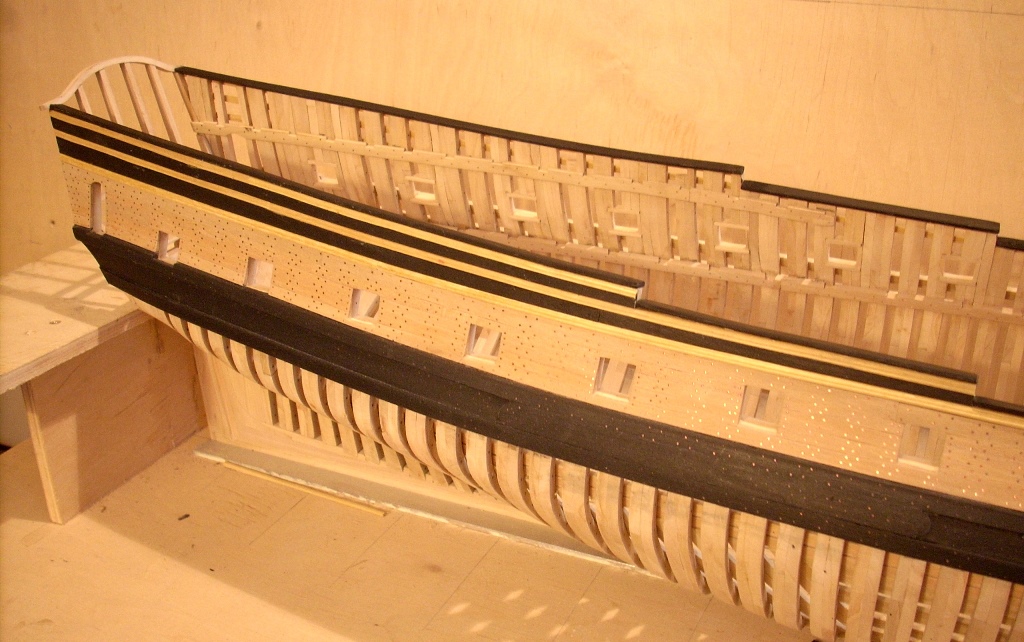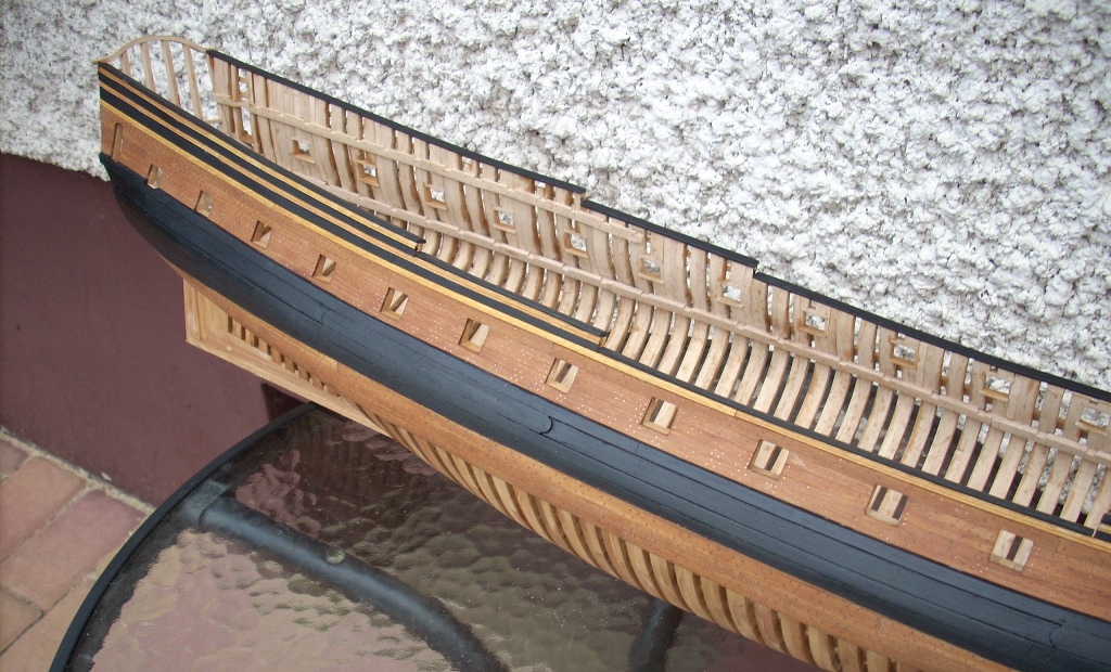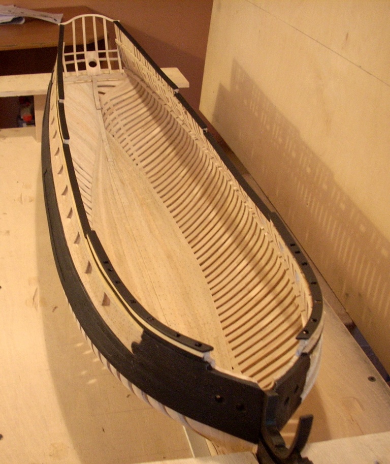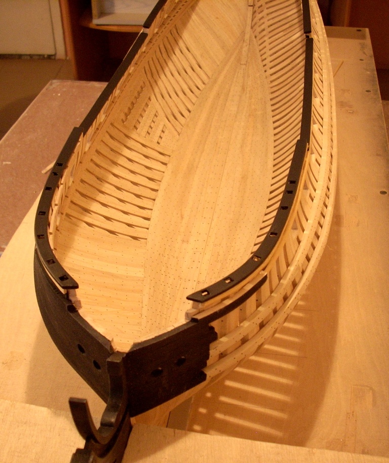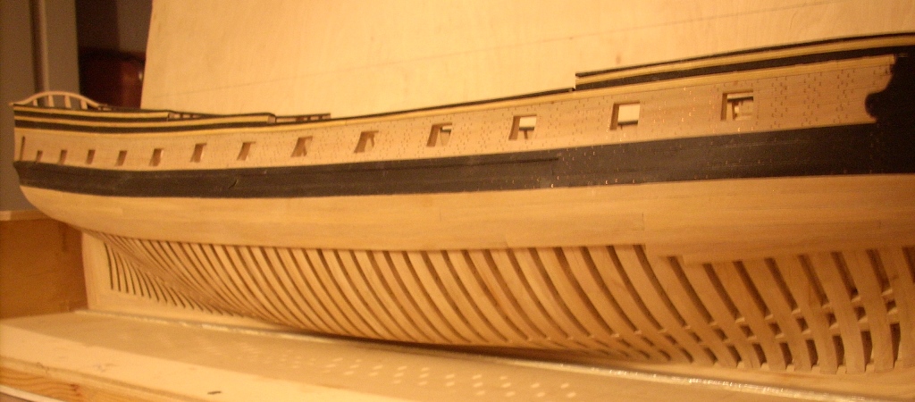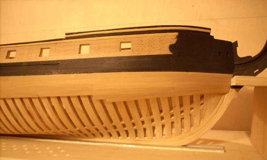 doszło trochę poszycia nie będzie na całości chciałem tylko pokazać jak to wygląda dołożę jeszcze po kilka listewek na dziobie i rufie by było widać stalersy , jeden już jest na dziobie :D