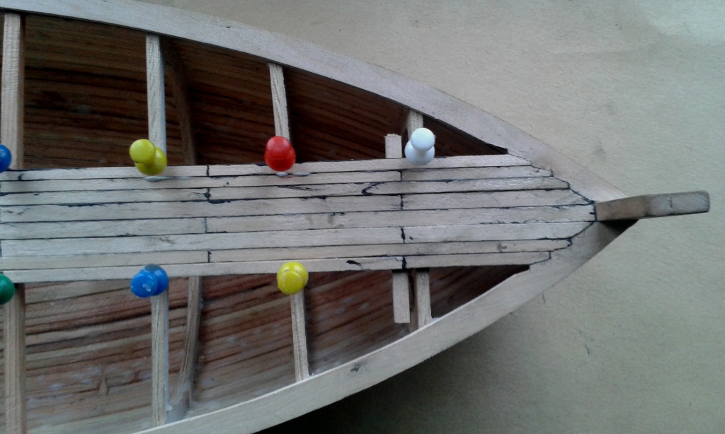 Jako że powoli wraca sprawność w lewej ręce, to trochę podłubałem. Przykleiłem skrajne deski pokładowe, więc powoli klejenie pokładu. Przykleiłem też dechy na rufie ale nie śmiać się bo jeszcze nie wyszlifowane.
