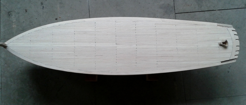 Mała aktualizacja i postęp w tworzeniu kaszalota :) . Pokład poklejony, niestety nie ustrzegłem się błędu, zresztą widać na zdjęciu. Poprzeczne nacięcia na niektórych deskach pouciekały i trzeba będzie trochę więcej przeszlifować żeby je poprawić. Te które naciąłem płycej, już znikły przy wstępnym szlifie.