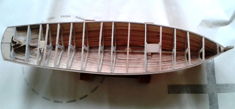 Kadłub wykonałem jako szkielet sklejkowy pokryty listewkami sosnowymi o przekroju 3x3 mm.. Jedynie tuleja przejściowa dla trzonu sterowego jest z dębiny. W niedługim czasie zacznę układać pokład z listew brzozowych. Z poszyciem muszę trochę poczekać na spracowanie kadłuba, a planuję układać je z okleiny olchowej 1,6 mm.. Przepraszam za fotki, ale robione w piwnicy przy sztucznym świetle i telefonem.
