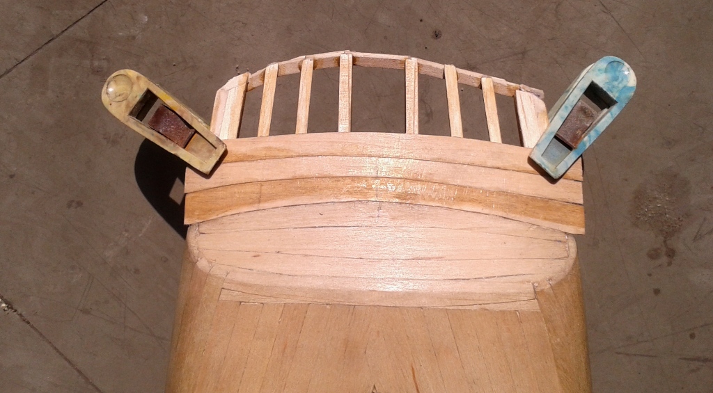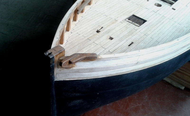To już pewnikiem ostatnia aktualizacja na następny miesiąc, urlop i kuracja szpitalna. Pomęczyłem się z nadburciami i belką podparapetową. Przy okazji zamontowane pierwsze kołkownice, a na dziobie zamontowany wspornik pod rolkę kotwiczną.