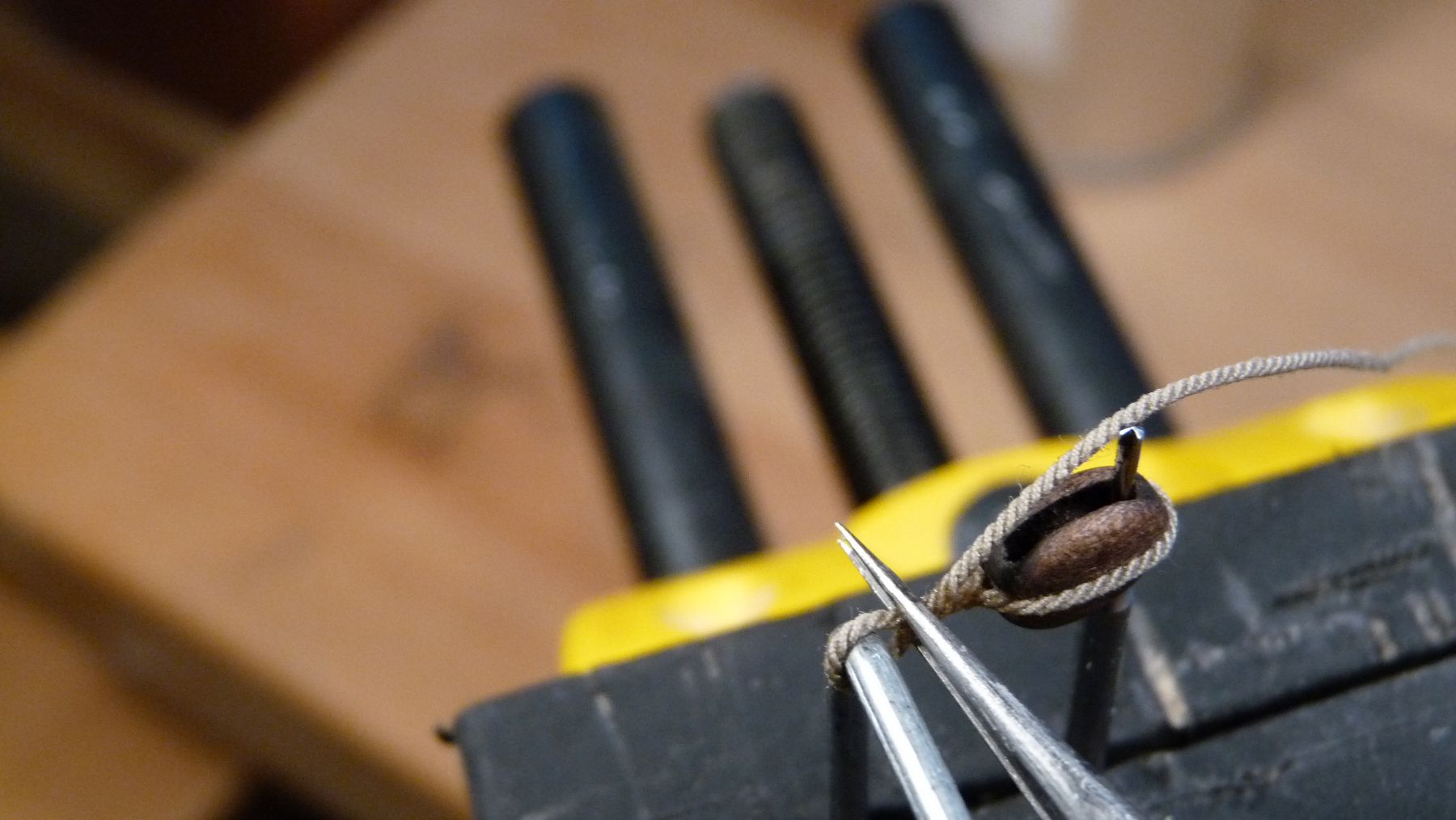 Poprawiłem kołkownice przy grotmaszcie, były pojedyncze rolki teraz są podwójne.Sznurek własnej produkcji i pierwsze bloczki zaczepione.