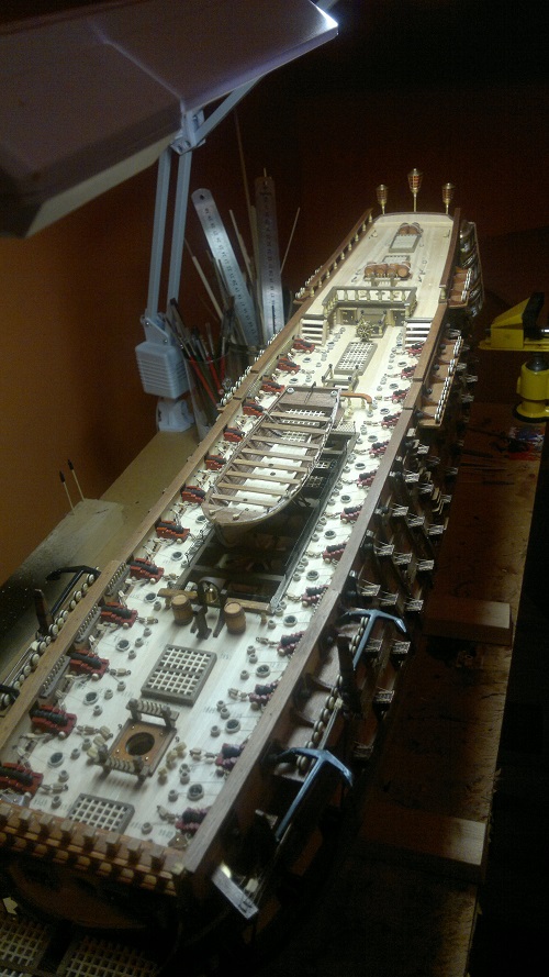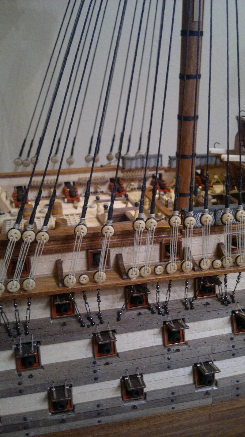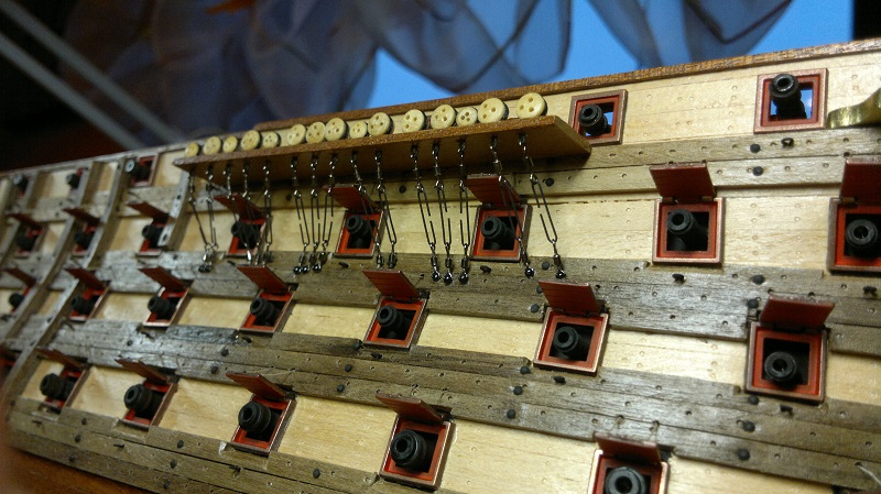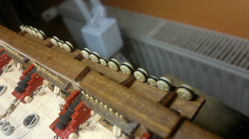 Hmmm... teraz jak to nazwać.. waloryzacja chyba bo inne słowo nie przychodzi na myśl. Jakieś zabezpieczenia by załoga nie powpadała Zastosowałem szpilki z oczkami potraktowane oksydą. Siateczka docięta na wymiar potem do kupy wszystko razem. Dodałem też zwinięte z linek pojemniczki na kule armatnie.