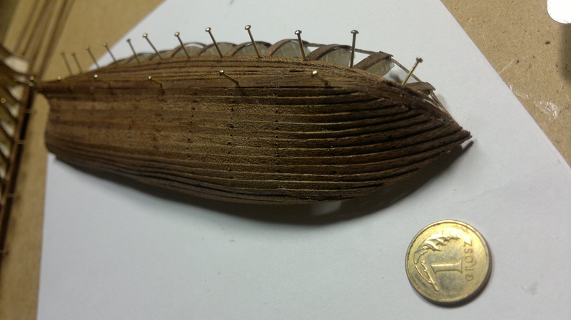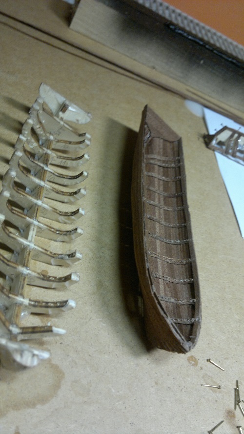 SZALUPY ! Tu od razu się przyznam że miałem dylemat jak te małe łódeczki wykonać. Forum i inne strony przewertowane i pytanie.. Czy robić jak w instrukcji czy coś więcej od siebie wymagać. Raz się żyje haha Wspomnę że wzorowałem się na waszych relacjach. Tylko że ja to troszeczkę inaczej zrobiłem. A więc na sam początek szkielet szalupy. Następnie taśma samoprzylepna w celu oklejenia żebrowania. Tu już wykorzystałem listewki fornirowe które przecinałem na pół i pokrywałem na zakładkę. (Listewka 4mm dzielona na 2mm a sama zakładka około 1mm )Przed każdym gwoździkiem wierciłem wiertełkiem 0.6mm. A to po to by listewki fornirowe nie pękały. Potem delikatnie na gwoździkach z małym użyciem kleju (pattex). Największe obawy były przy wyciąganiu szkieletu. Naprawdę delikatnie podważając separacja okazała się dla mnie szczęśliwa. Potem kosmetyka szlifowanie lakierek itd.