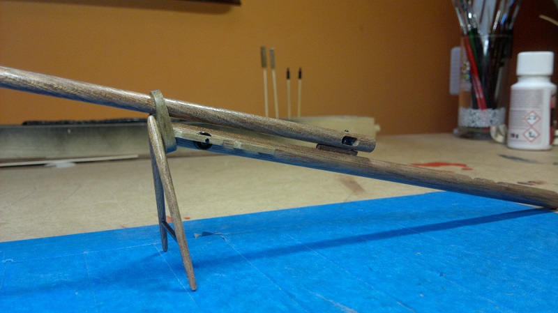 Cześć dziś czas na maszty. Opieram się na planach dołączonych do zestawu. Ta sama technika jak przy bukszprycie wiertareczka papier ścierny itd. Co do platform to te gotowe z ramek postanowiłem pokryć listewkami forniru. Następnie szlifowanie. Teraz moi mili muszę przyznać się do błędu. Chodzi o te trójkąciki na platformach. Kiedy podszkoliłem się w tym zagadnieniu teraz już wiem co i jak. Załączam zdjęcie jak to powinno wyglądać. Niestety człowiek na błędach się uczy a żeby to poprawić to już troszkę było za późno. Następnym razem na pewno będę o tym pamiętać. Dodano też bloczki jufersy owijki na trzpieniach listwy fornirowe z gruszy itd itd. Przesyłam kilka zdjęć bo akurat na tym etapie nie zrobiłem ich za wiele