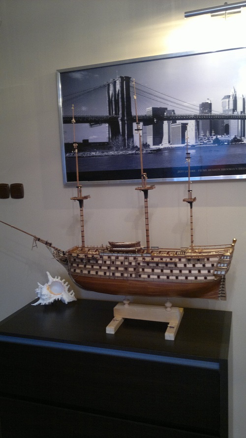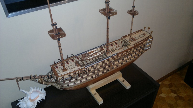 Analogicznie wykonałem mniejszą szalupę Z nudów zrobiłem maszty z nawiniętymi żaglami. (Żagle brudziłem w późniejszym czasie) Całość zamontowanie na okręcie przy pomocy drewnianych tralek 20mm, które troszkę skróciłem. Całość wzmocniona podporami by szalupy stabilnie siedziały.