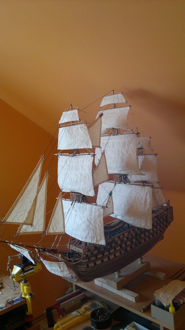 Niejako z sentymentu śledzę twoją relację od początku (choć sam już nie mam serca do tego modelu i poczeka sobie na lepsze czasy :) ). Na początek zgadzam się z opinią Leona, że te słupki podtrzymujące model są zbyt delikatne (wręcz filigranowe ;) ) do tak masywnego okrętu. No ale to rzecz gustu a gustach się nie dyskutuje ;)