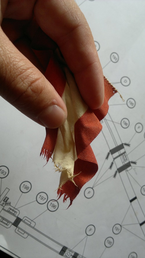 Na samym początku szerszym pędzelkiem barwiłem kremowym humbrolem co dało efekt pożółknienia ..szybkie suszenie zwykłą suszarką.. kolejny raz tylko ze nadanie odcienia szarości na jednym z brzegów. Kolejne suszenie... kiedy już kolor w miarę był to do usztywnienia wstępnego użyłem po prostu rozcieńczonego w ciepłej wodzie kleju pattex..i suszenie... To nadało troszkę sztywności co potrzebne do malowania by farba nie rozlewała się po materiale. Kolor czerwony jaki użyłem to humbrol nr.60.
