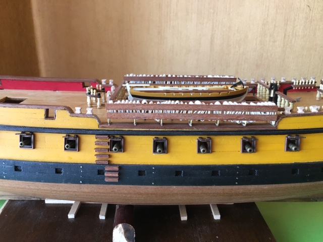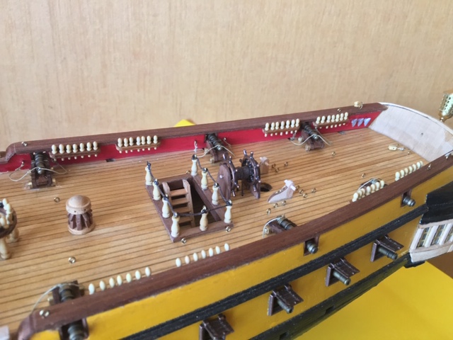 Prace powoli ruszyły. Pracuję nad poszyciem kadłuba. Jest to podposzycie. Kolejna warstwa w części pod linią wodną będzie oklejana brązowym fornirem. Niedokładności w pomalowaniu gretingów są niewidoczne. Niemniej zdjęcia macro uwidaczniają każdą niedokładność.