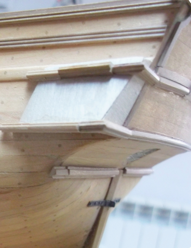 Wklejenie tych gzymsów na rufie było nadspodziewanie trudne, ciągłe pasowanie, klejenie i zrywanie.